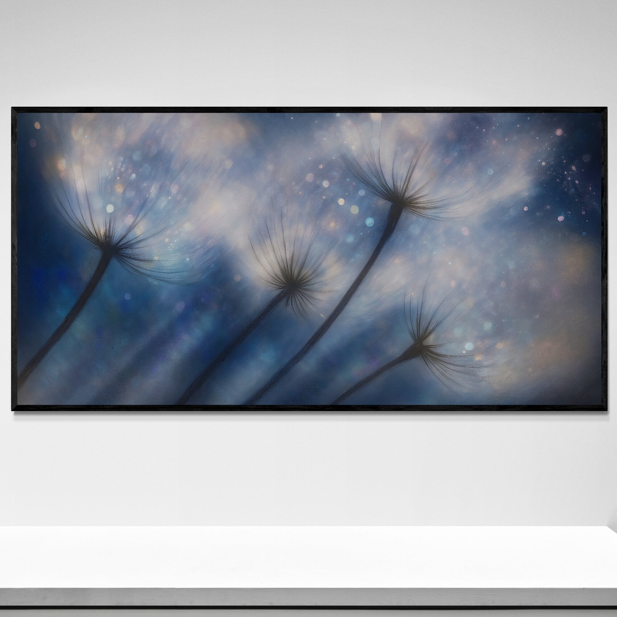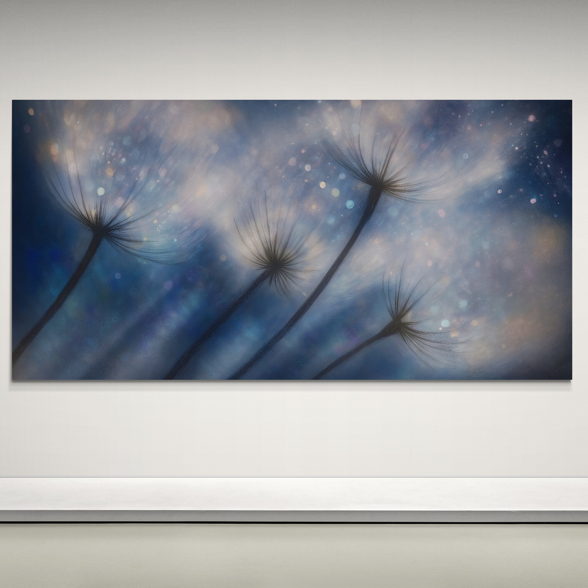 This artwork features delicate dandelion silhouettes set against a soft, glowing blue background with shimmering bokeh accents.
