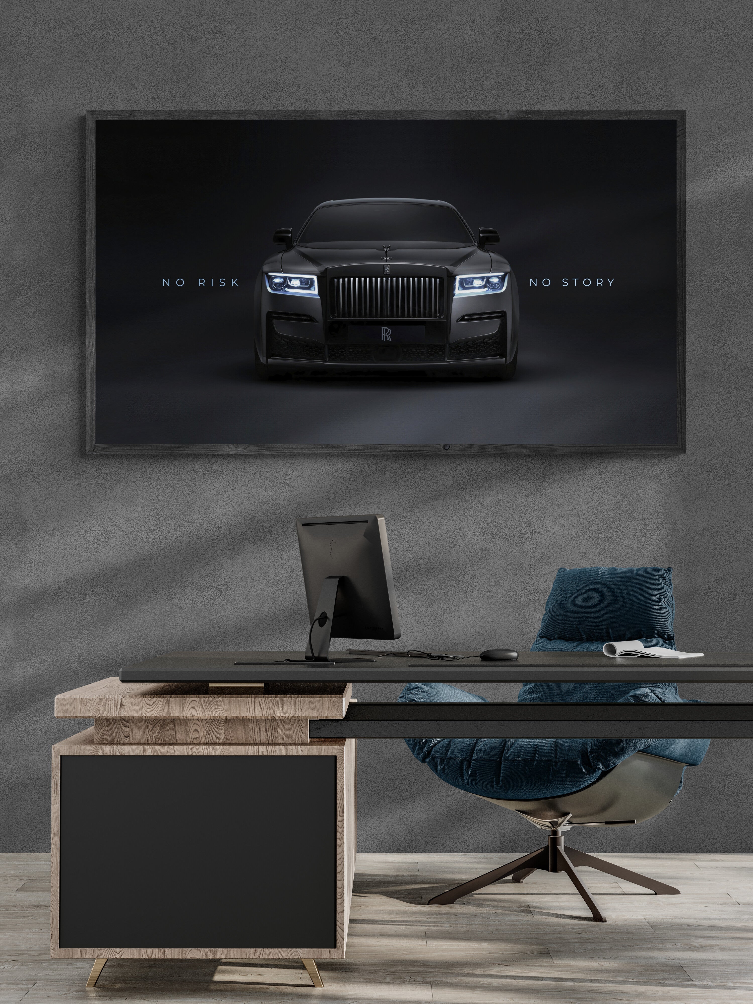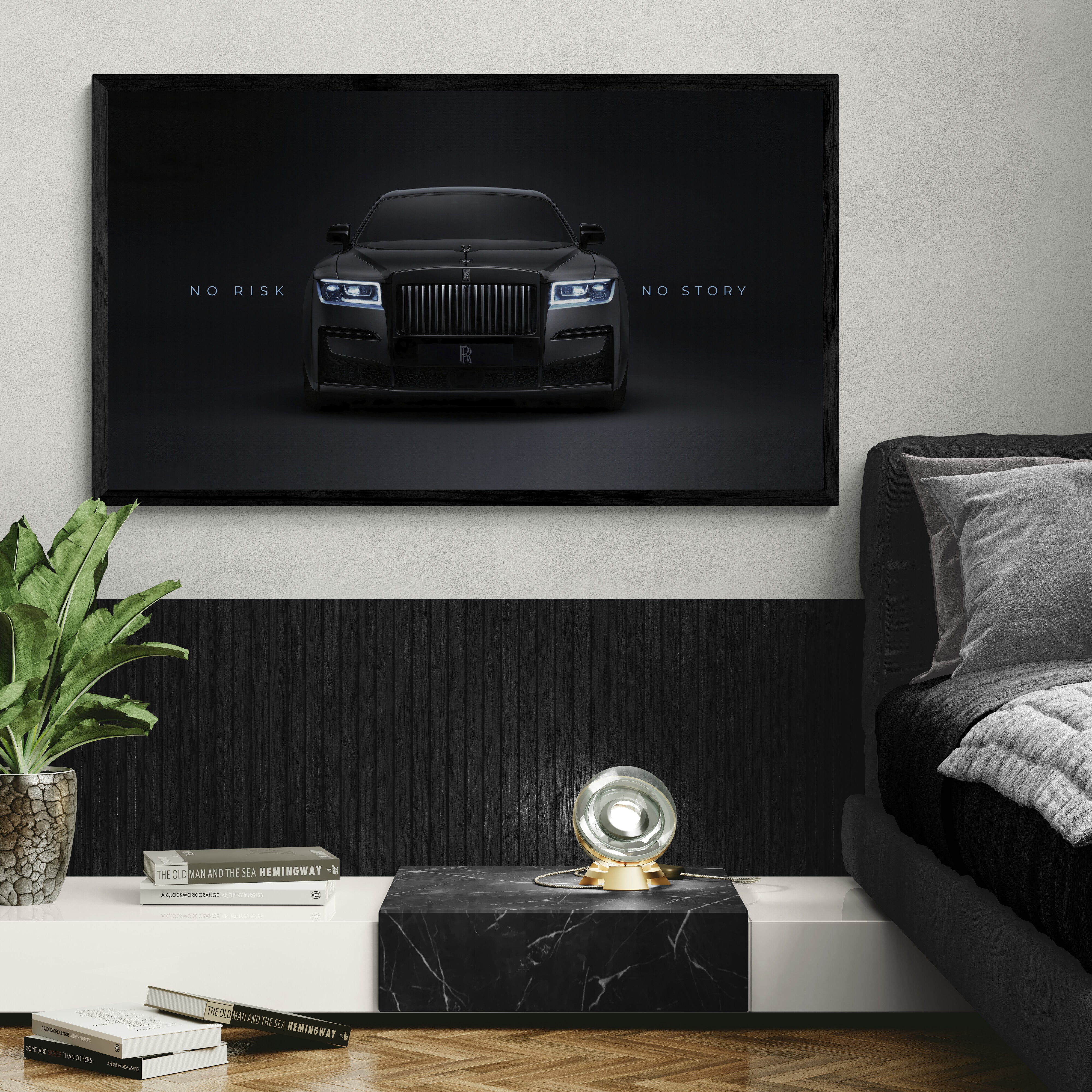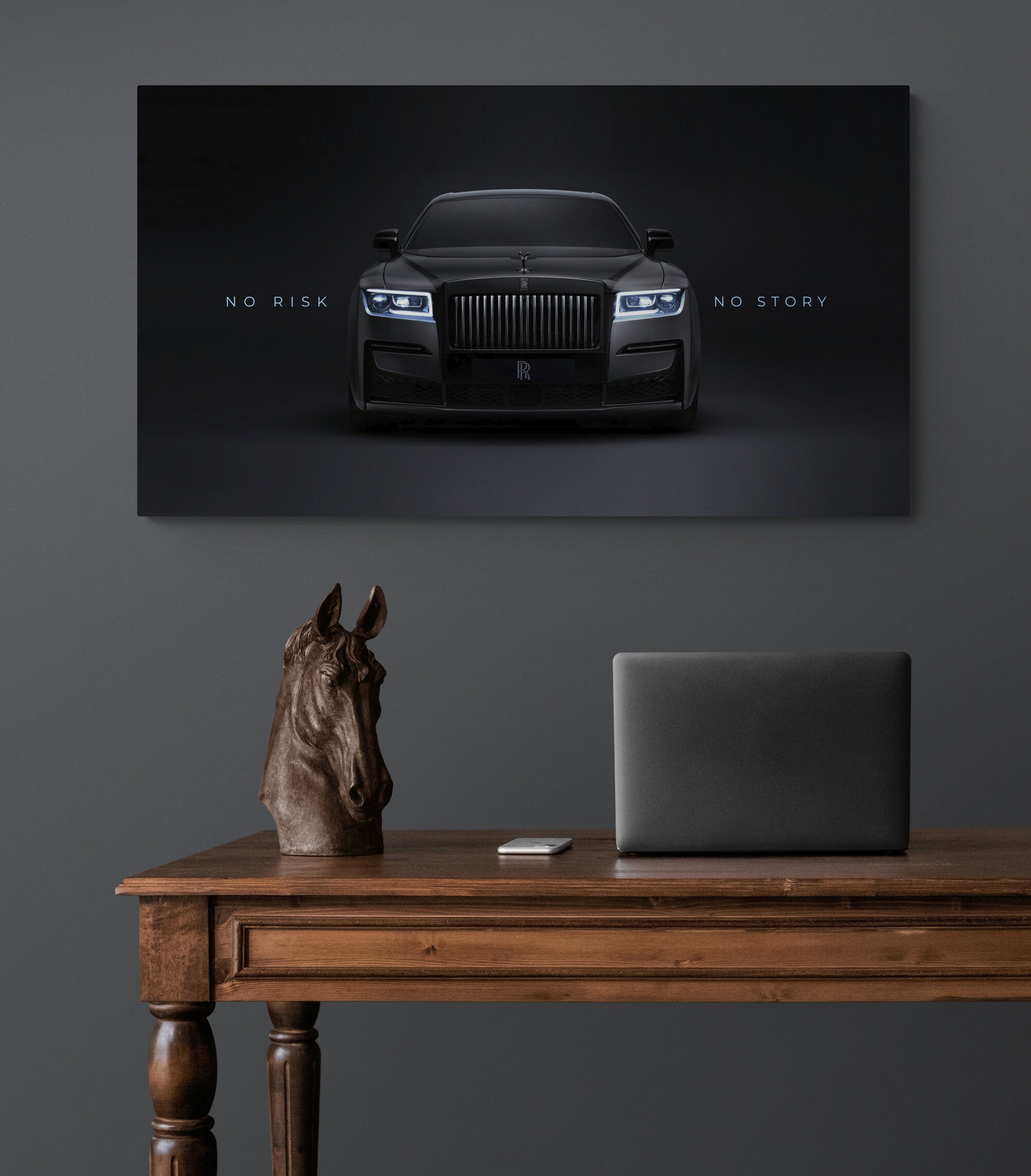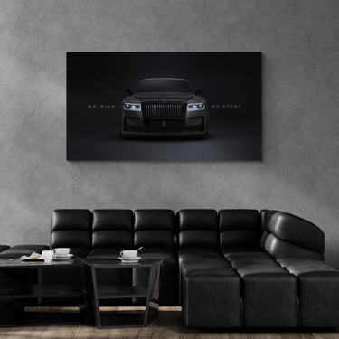 Elevate your space with this Rolls-Royce canvas wall art – a striking black luxury car print featuring the motivational quote “No Risk No Story”. Perfect for those who appreciate elegance, success, and high-end design, this artwork combines automotive power and inspiration in one piece.