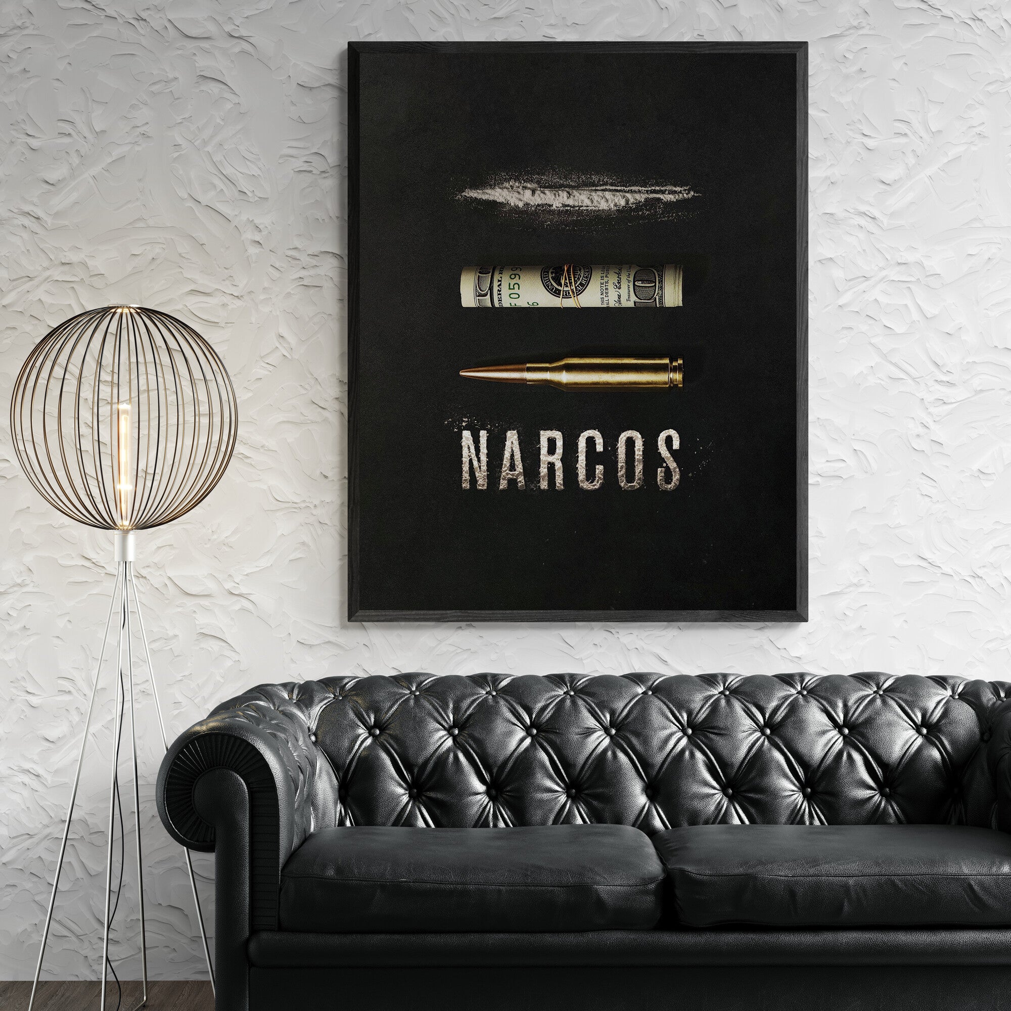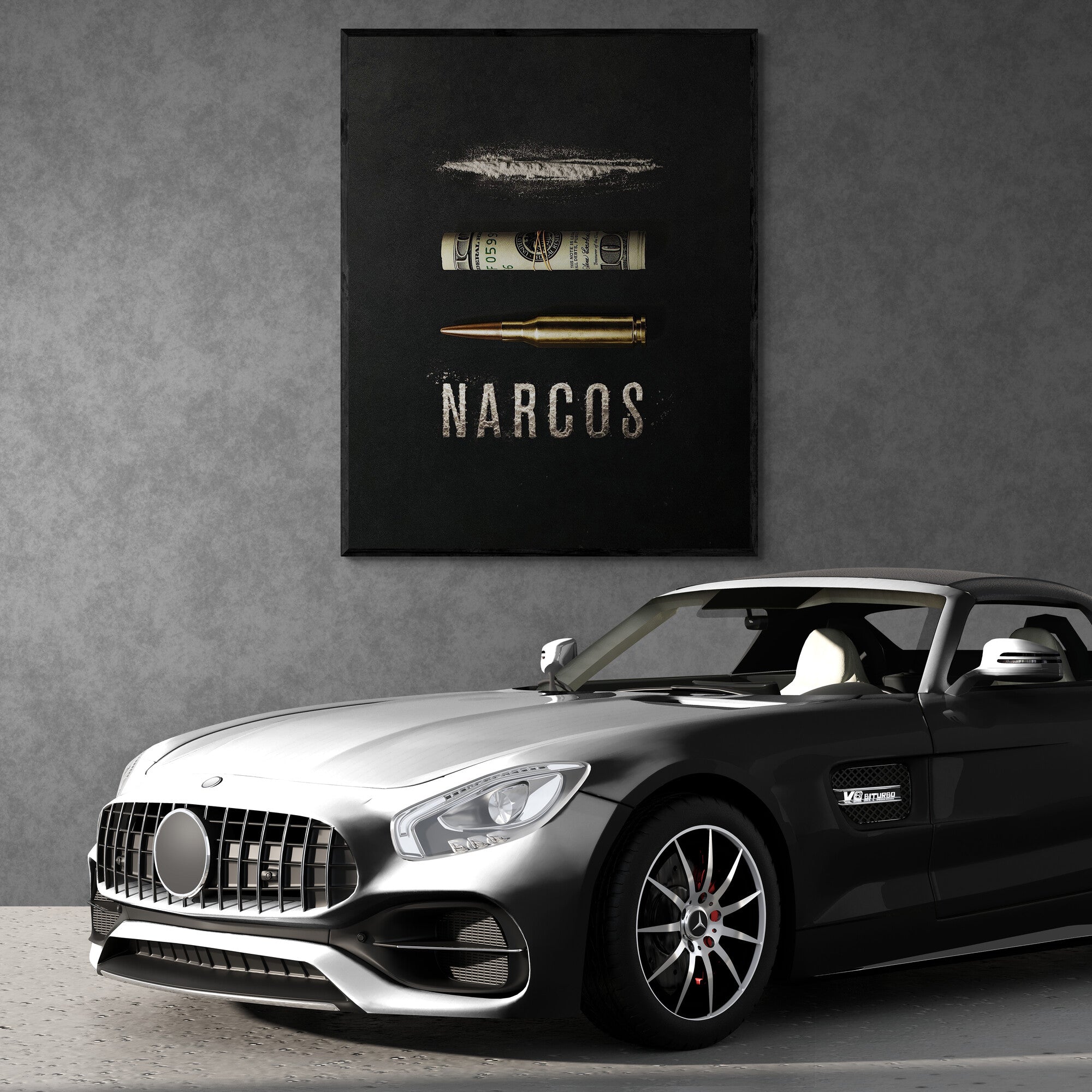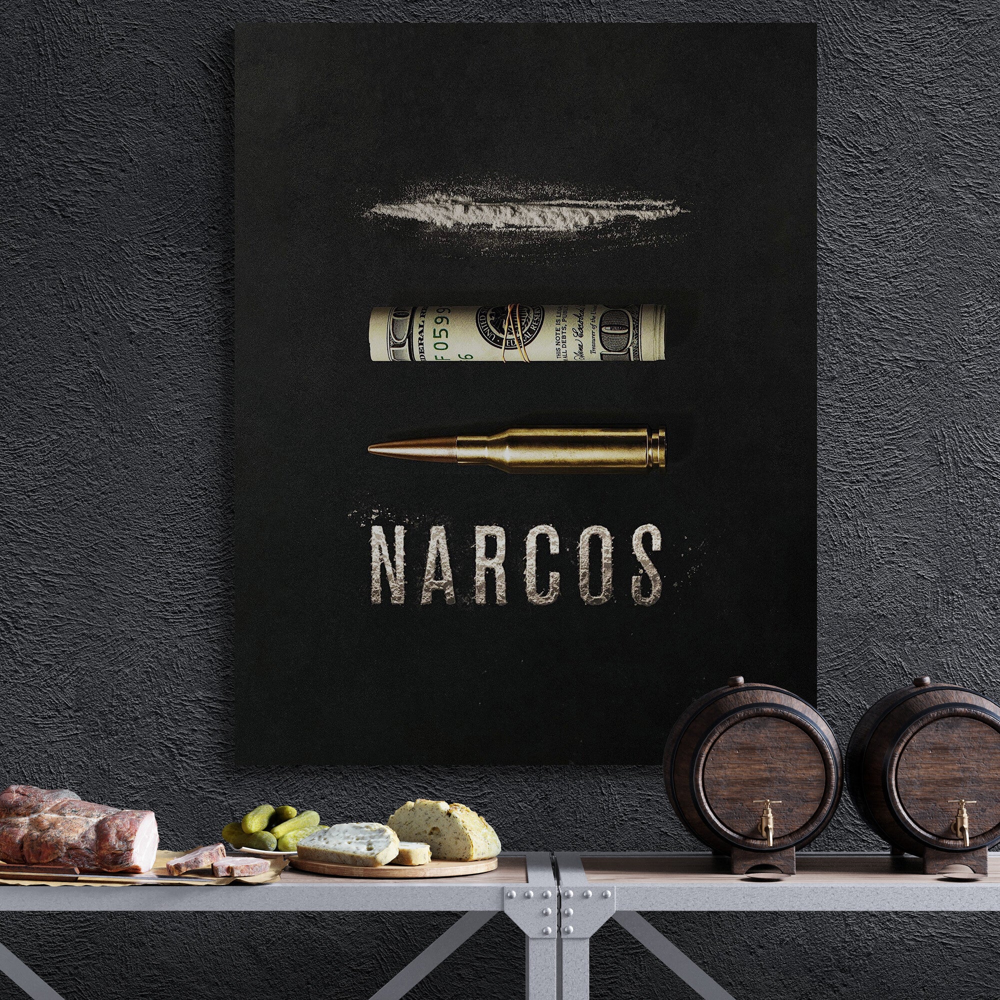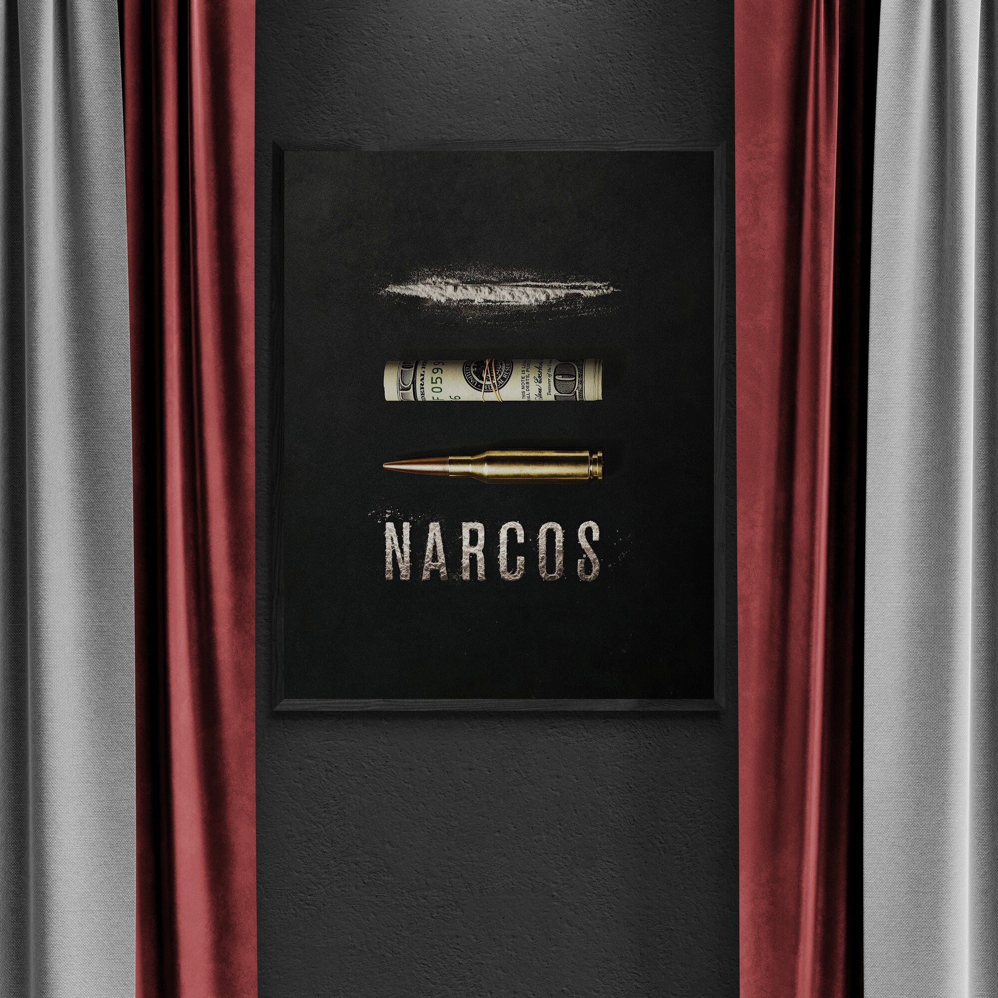 The artwork features a symbolic trio — a rolled bill, a bullet, and the bold “NARCOS” typography — arranged on a deep black background for maximum contrast and visual impact.