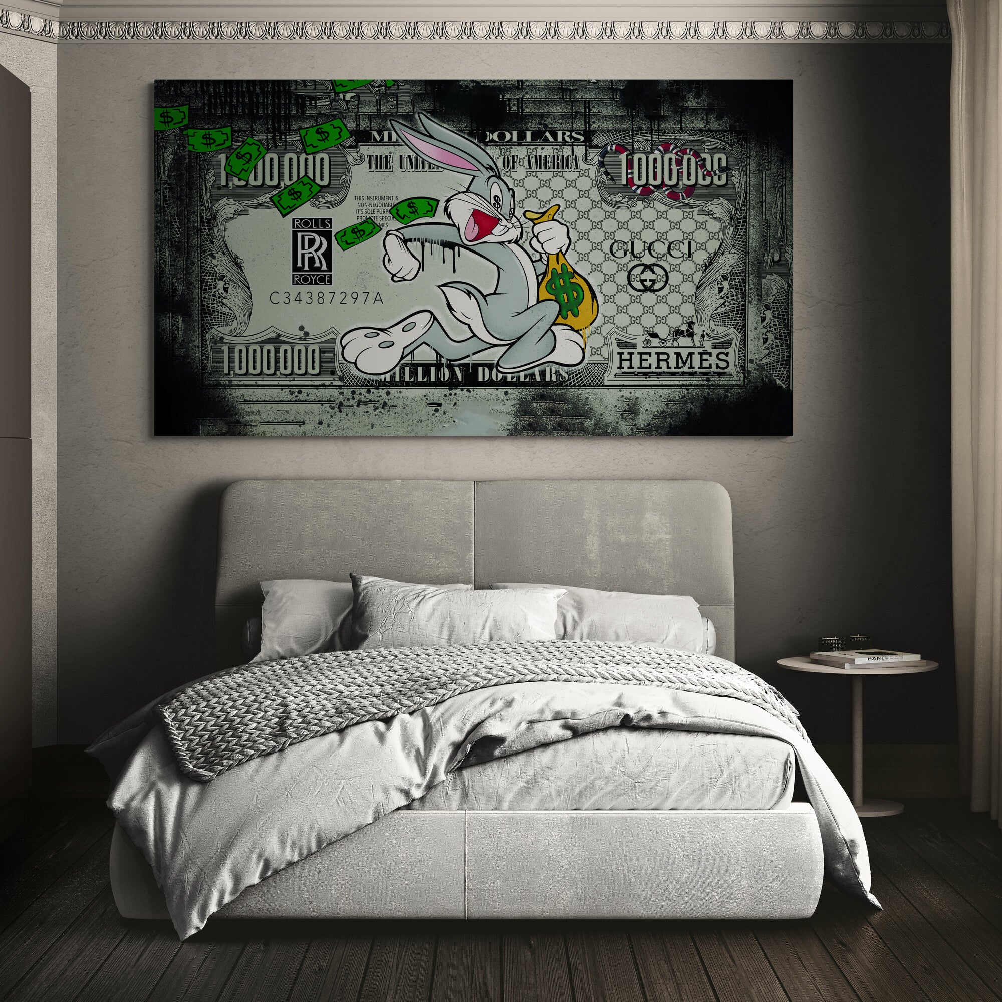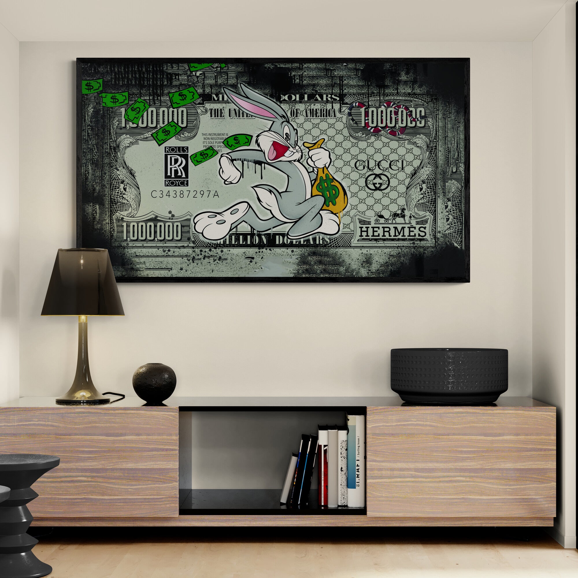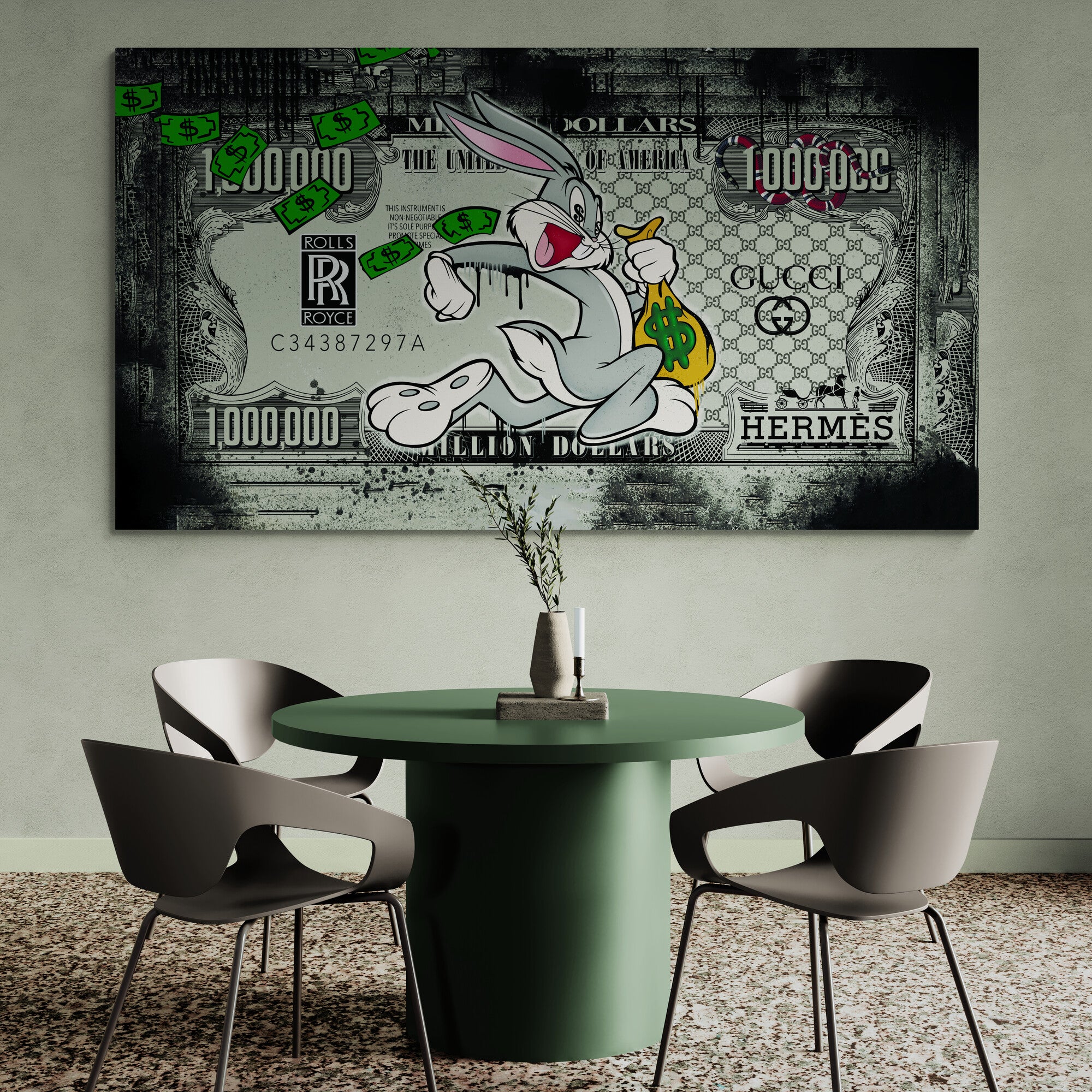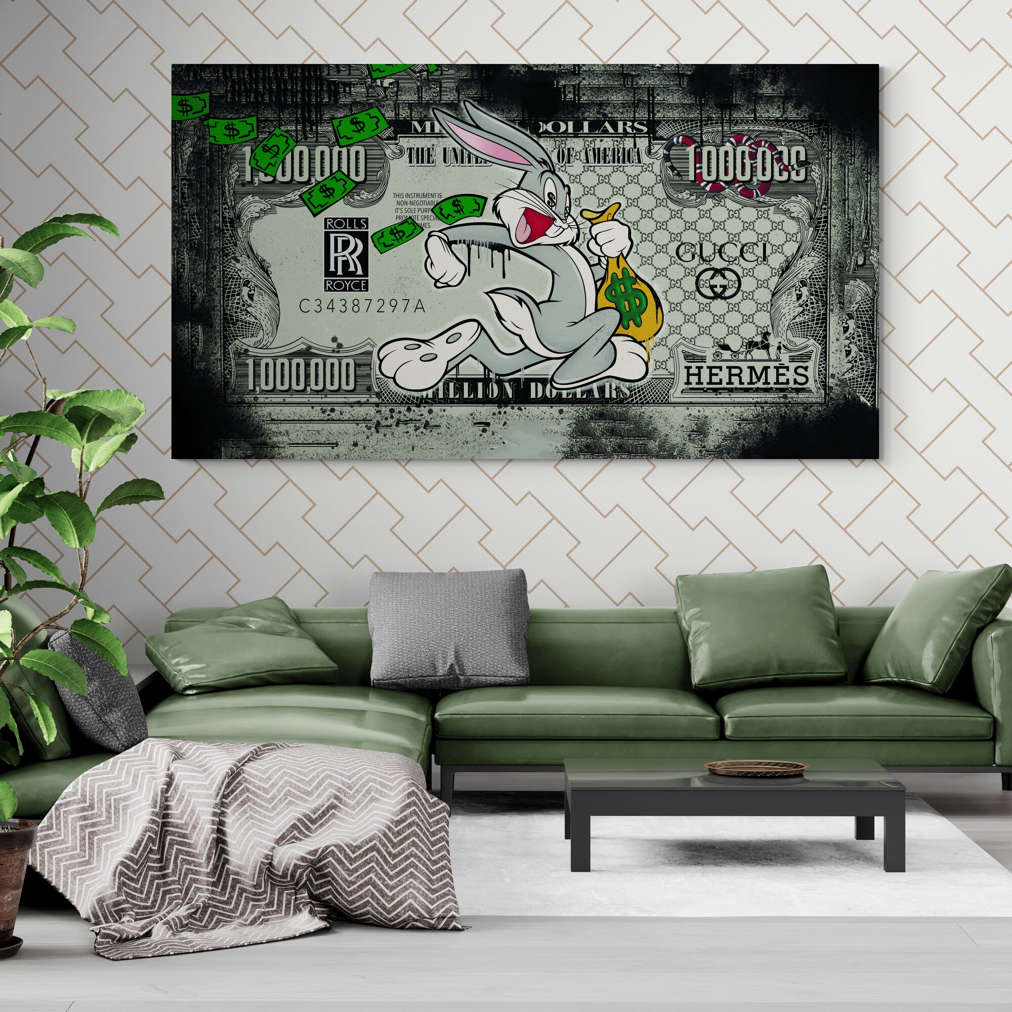 The “Money Bunny” Pop Art Canvas captures the playful yet ambitious spirit of modern hustle culture. Featuring an animated bunny sprinting with a bag of cash over a luxury dollar bill background, this artwork blends street graffiti, pop culture, and high-end fashion vibes into one statement piece.