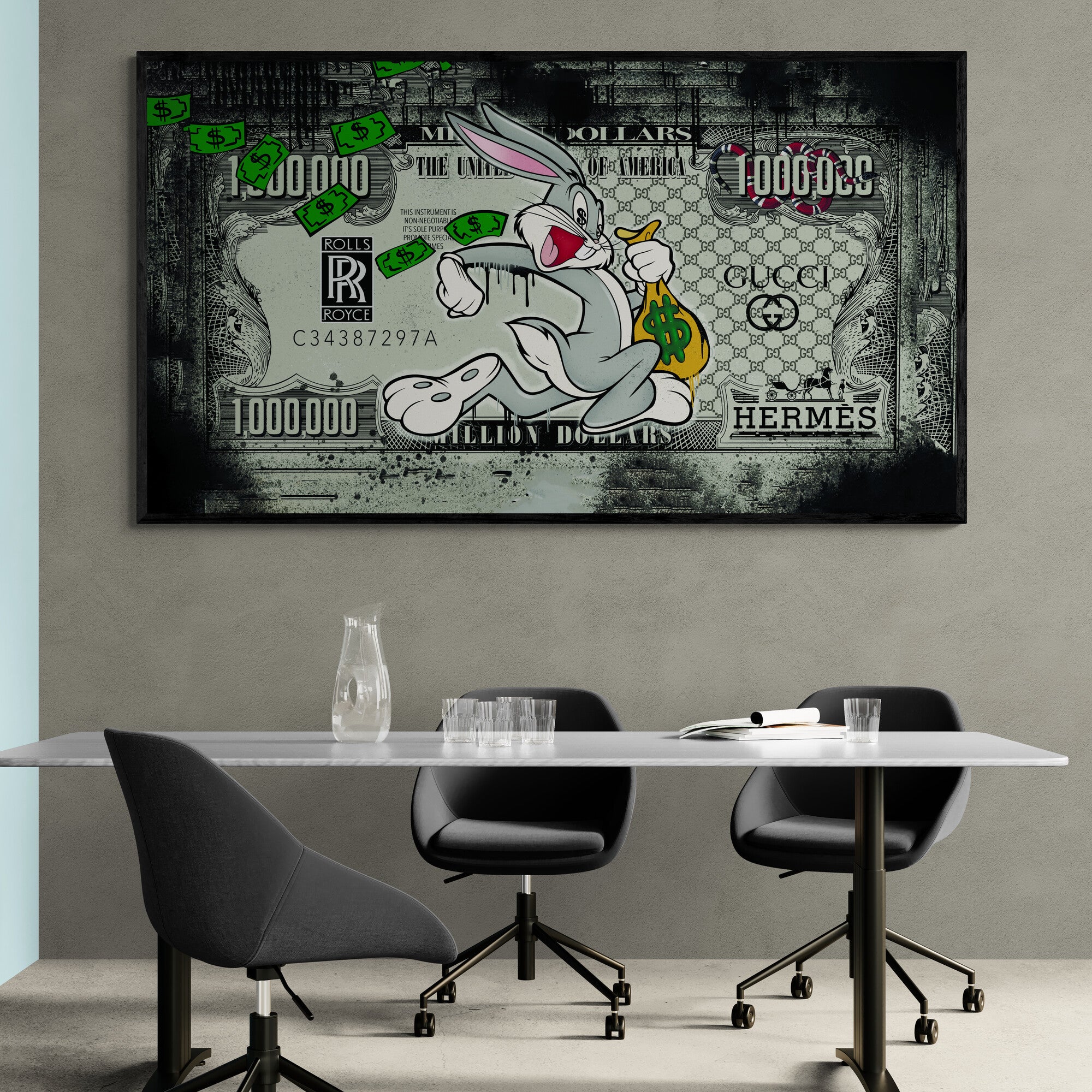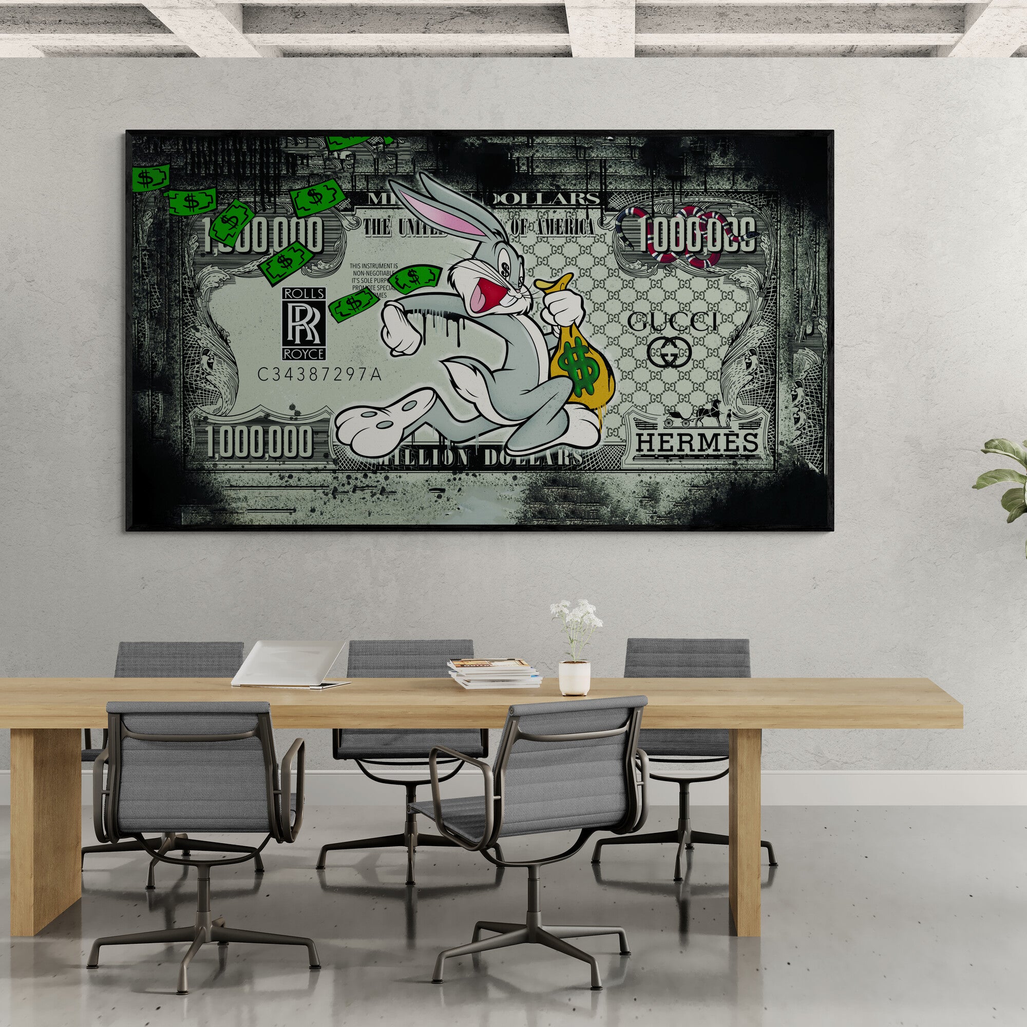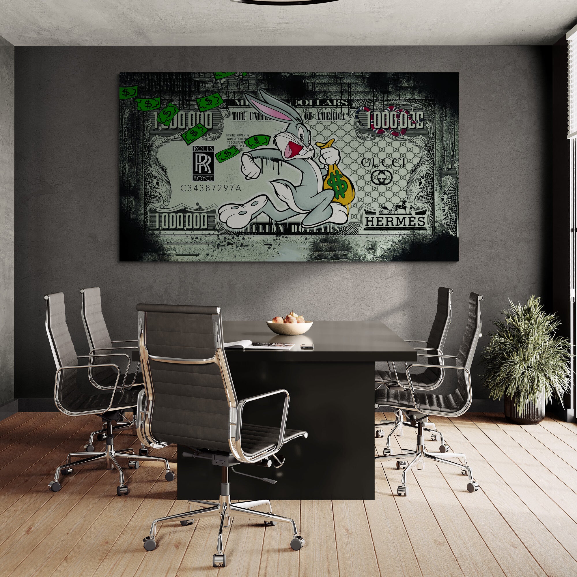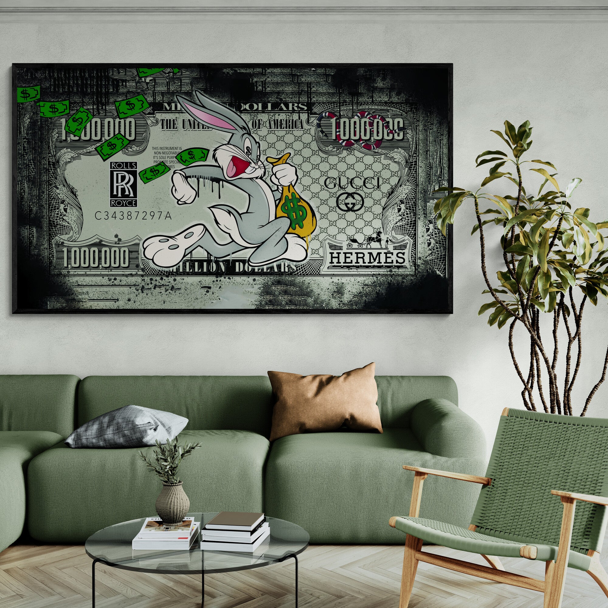 The “Money Bunny” Pop Art Canvas captures the playful yet ambitious spirit of modern hustle culture. Featuring an animated bunny sprinting with a bag of cash over a luxury dollar bill background, this artwork blends street graffiti, pop culture, and high-end fashion vibes into one statement piece.