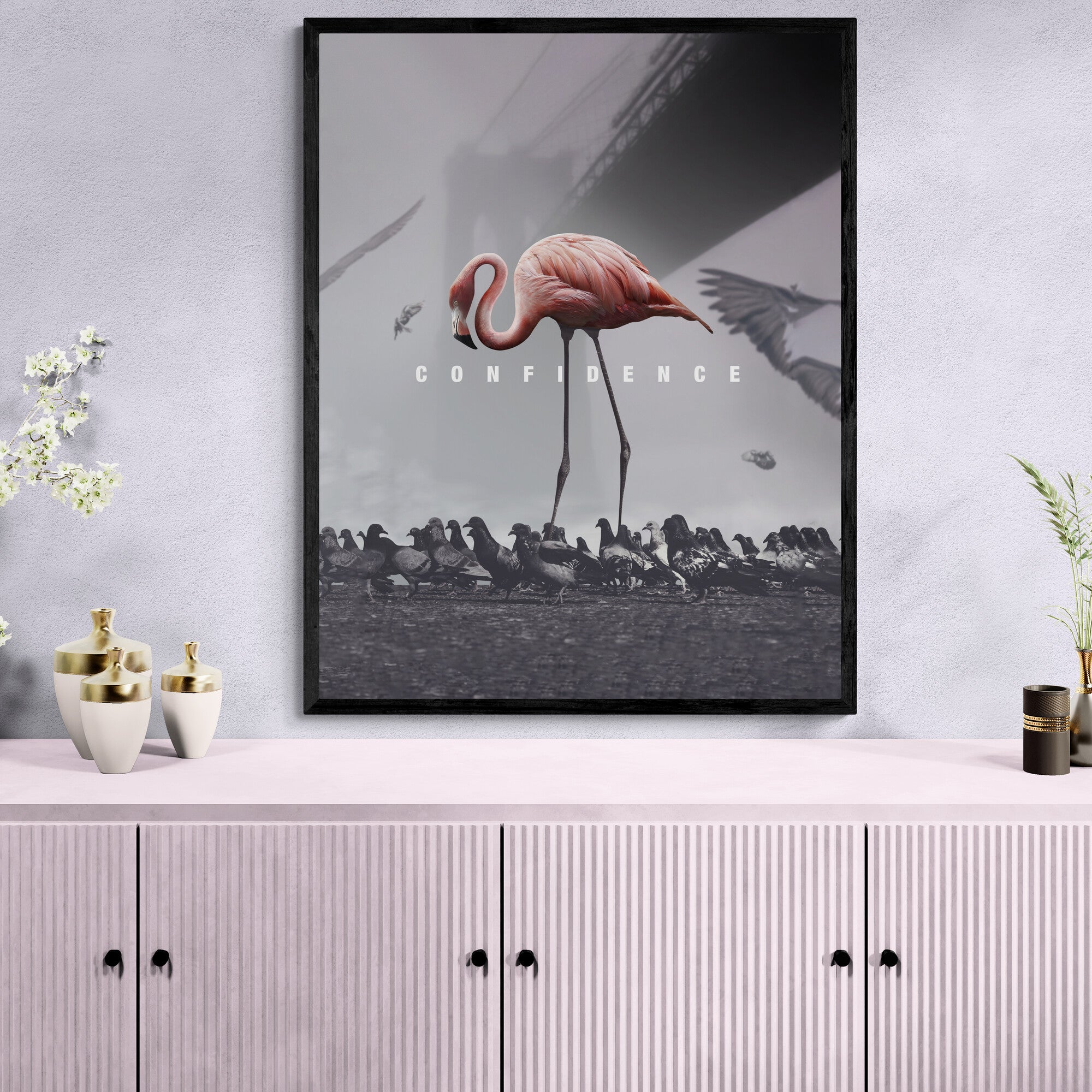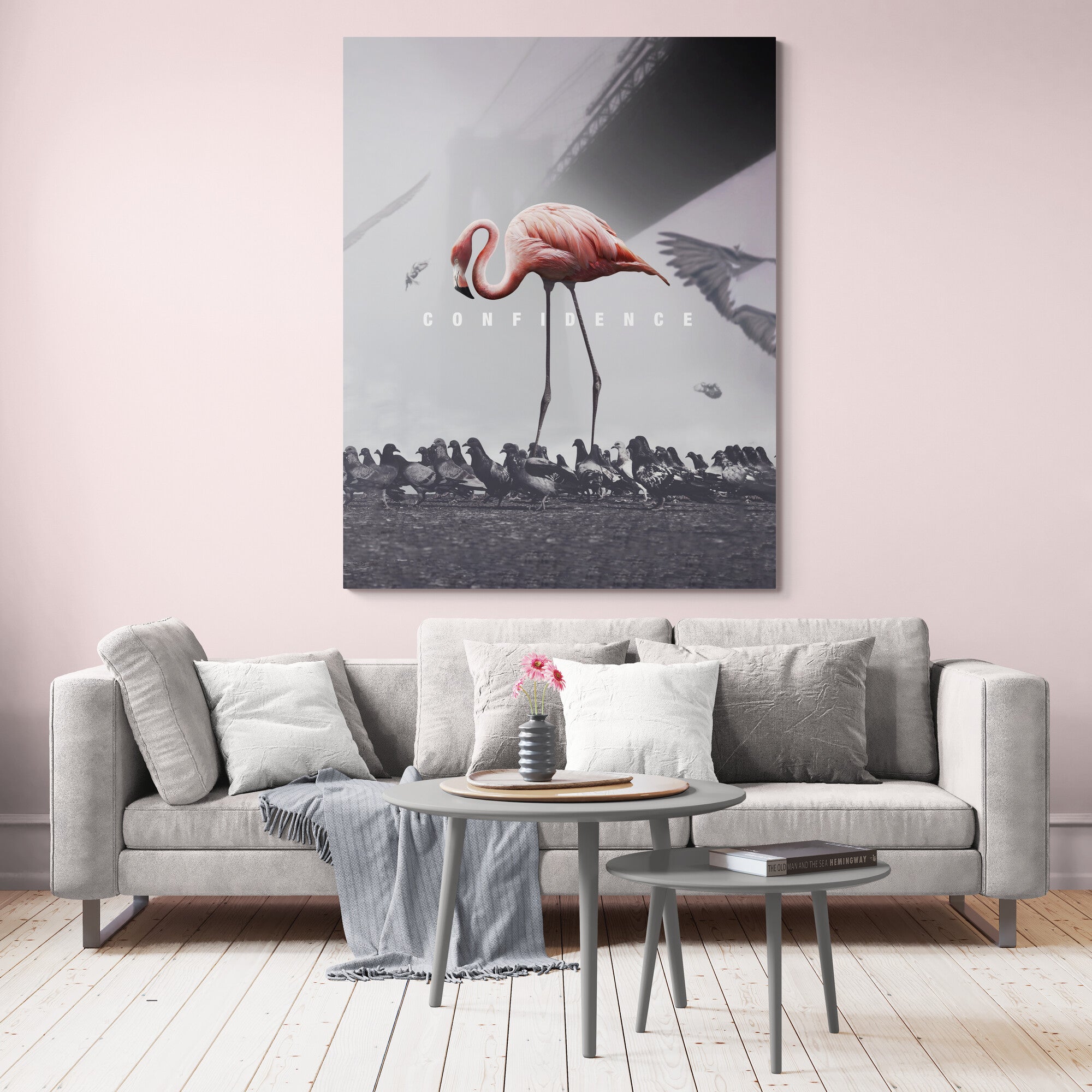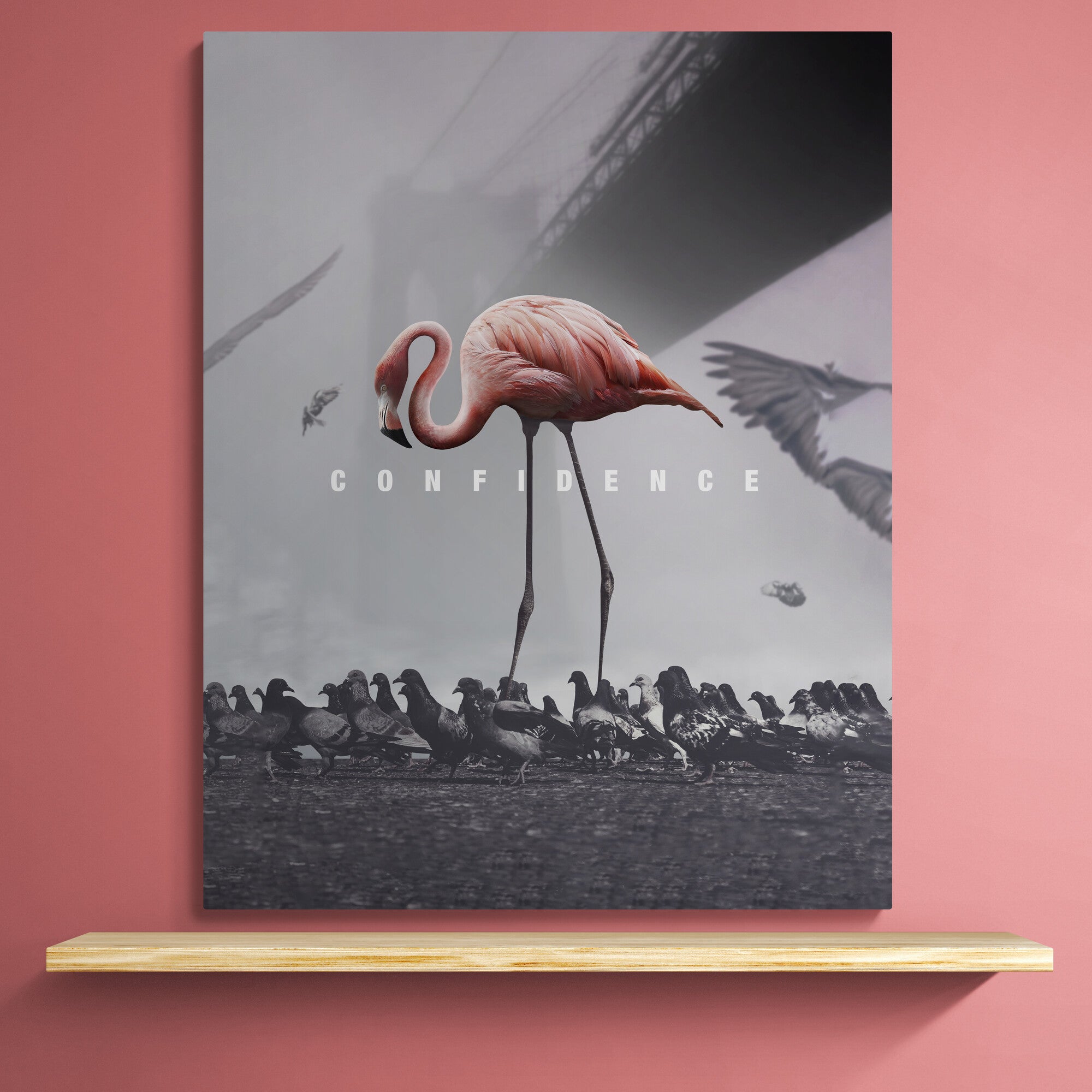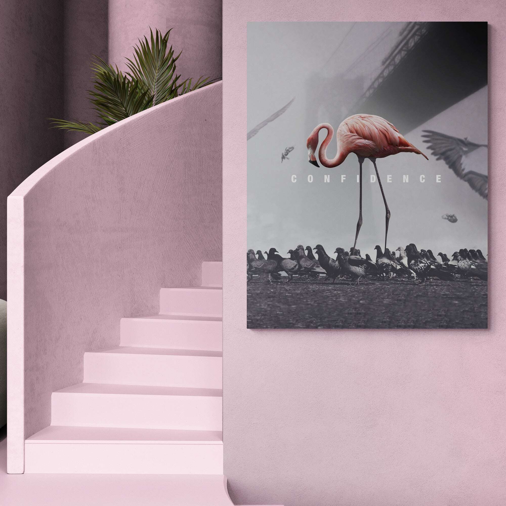 This elegant “CONFIDENCE” motivational flamingo canvas represents individuality, self-belief, and the courage to stand out. The striking pink flamingo rising above a crowd of pigeons perfectly symbolizes strength, uniqueness, and grace — making it the ideal statement piece for any modern interior.
