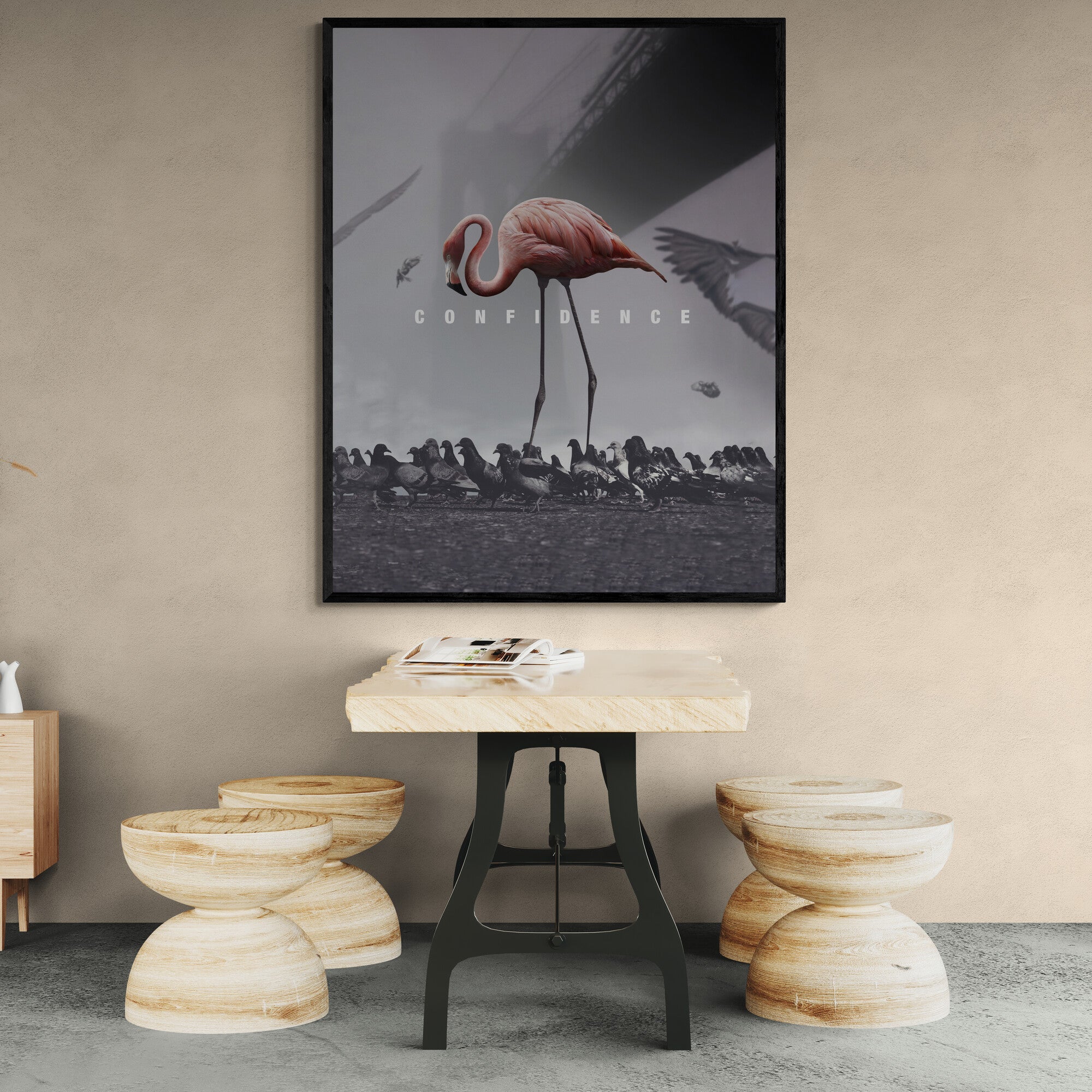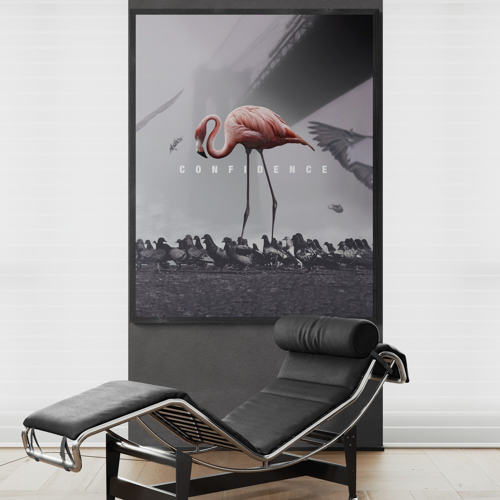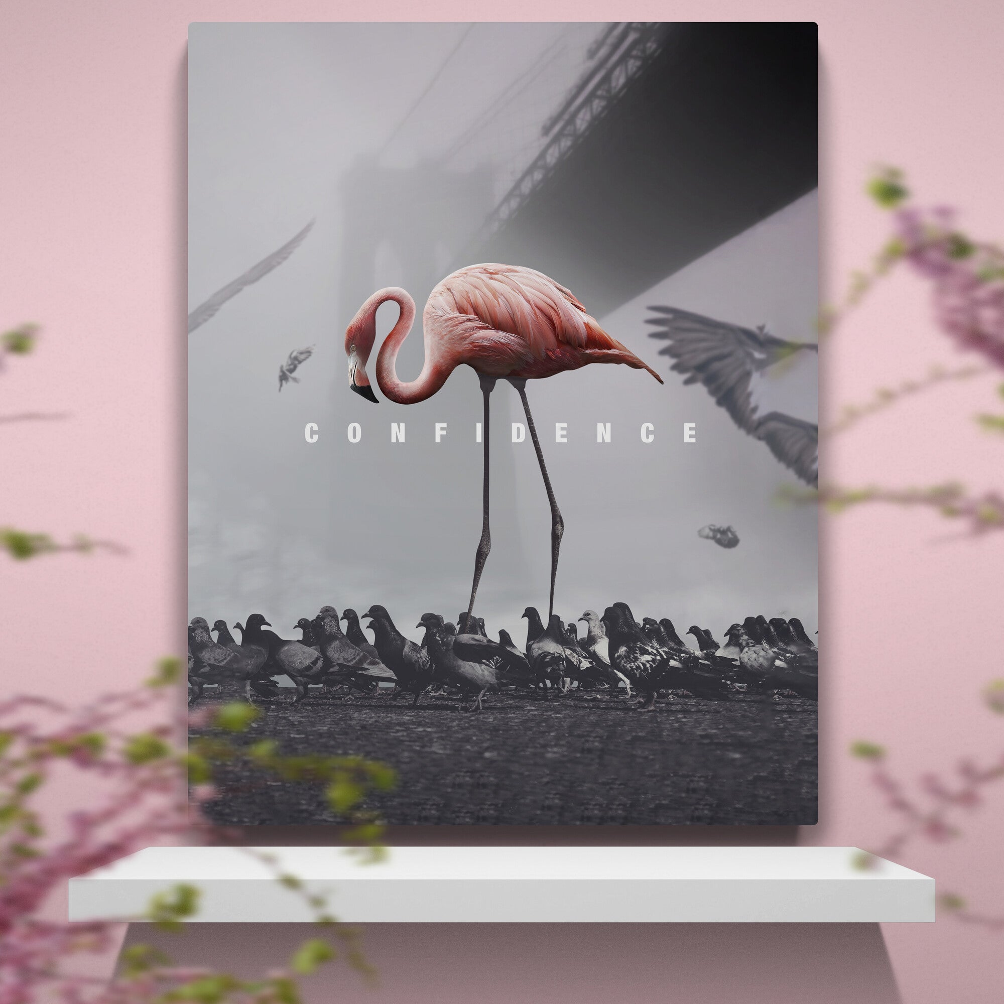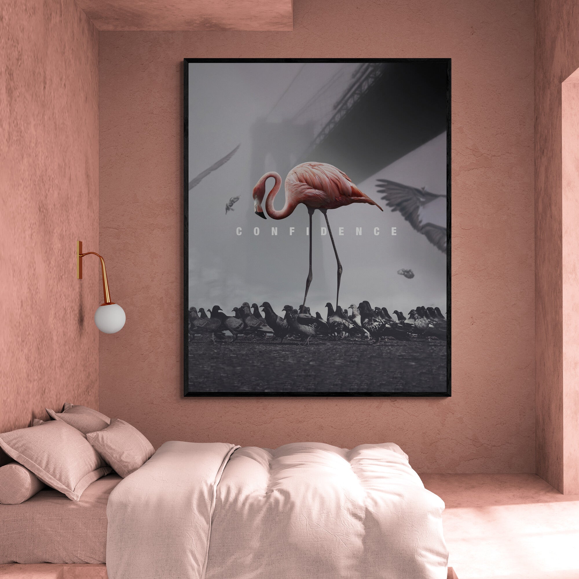 This elegant “CONFIDENCE” motivational flamingo canvas represents individuality, self-belief, and the courage to stand out. The striking pink flamingo rising above a crowd of pigeons perfectly symbolizes strength, uniqueness, and grace — making it the ideal statement piece for any modern interior.