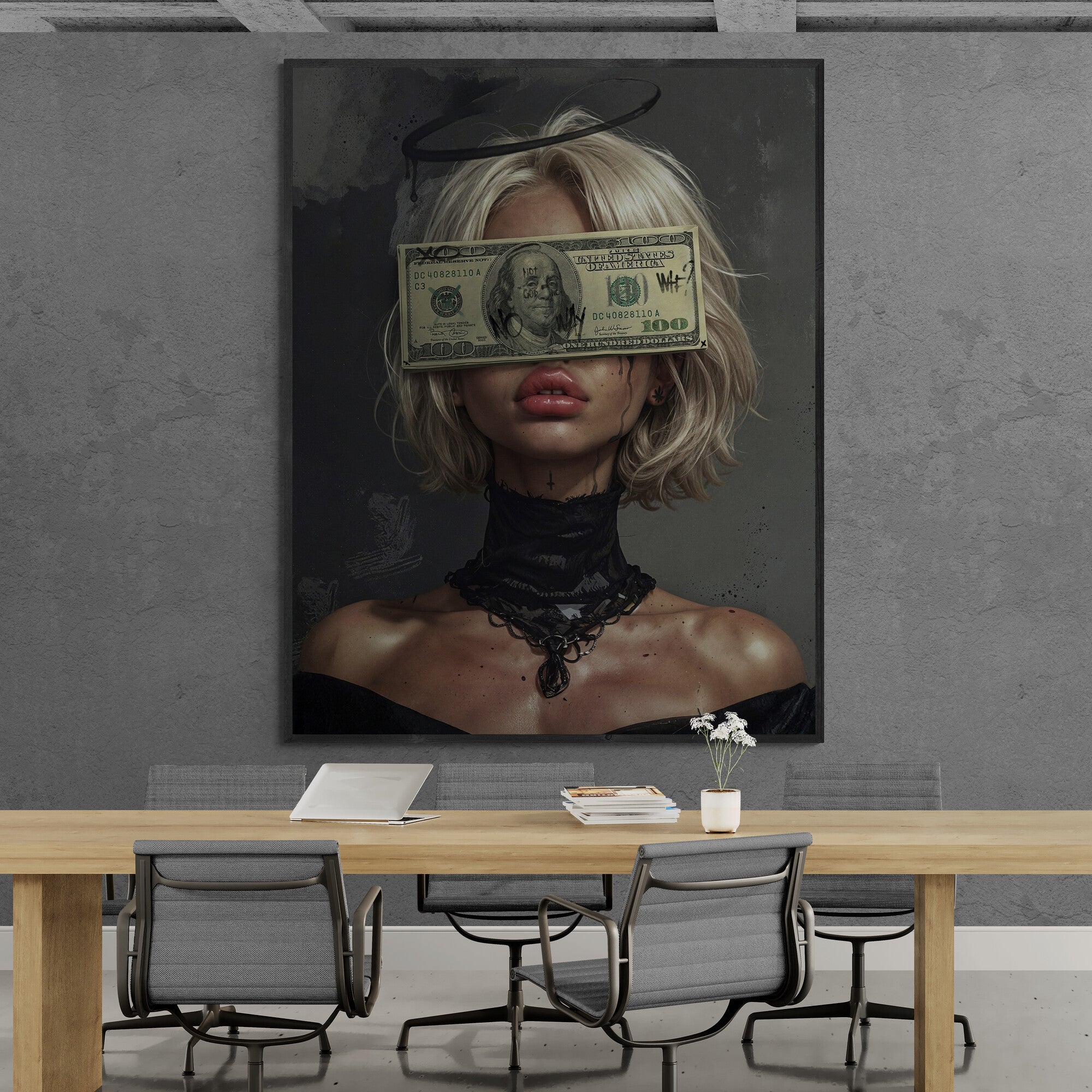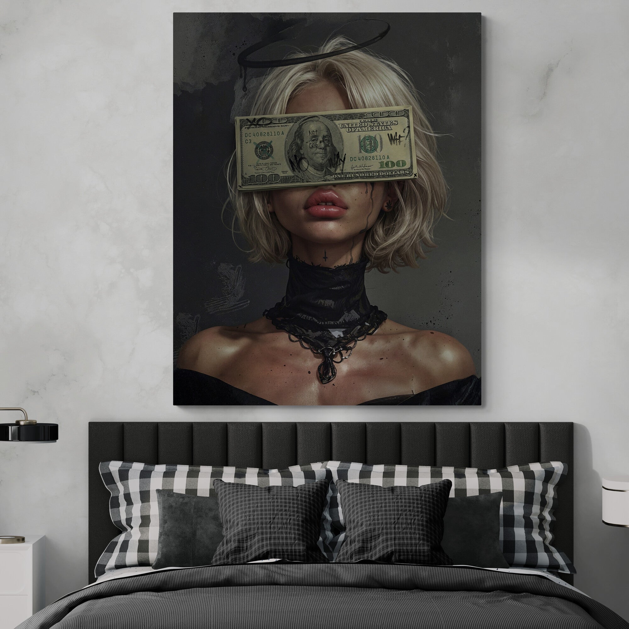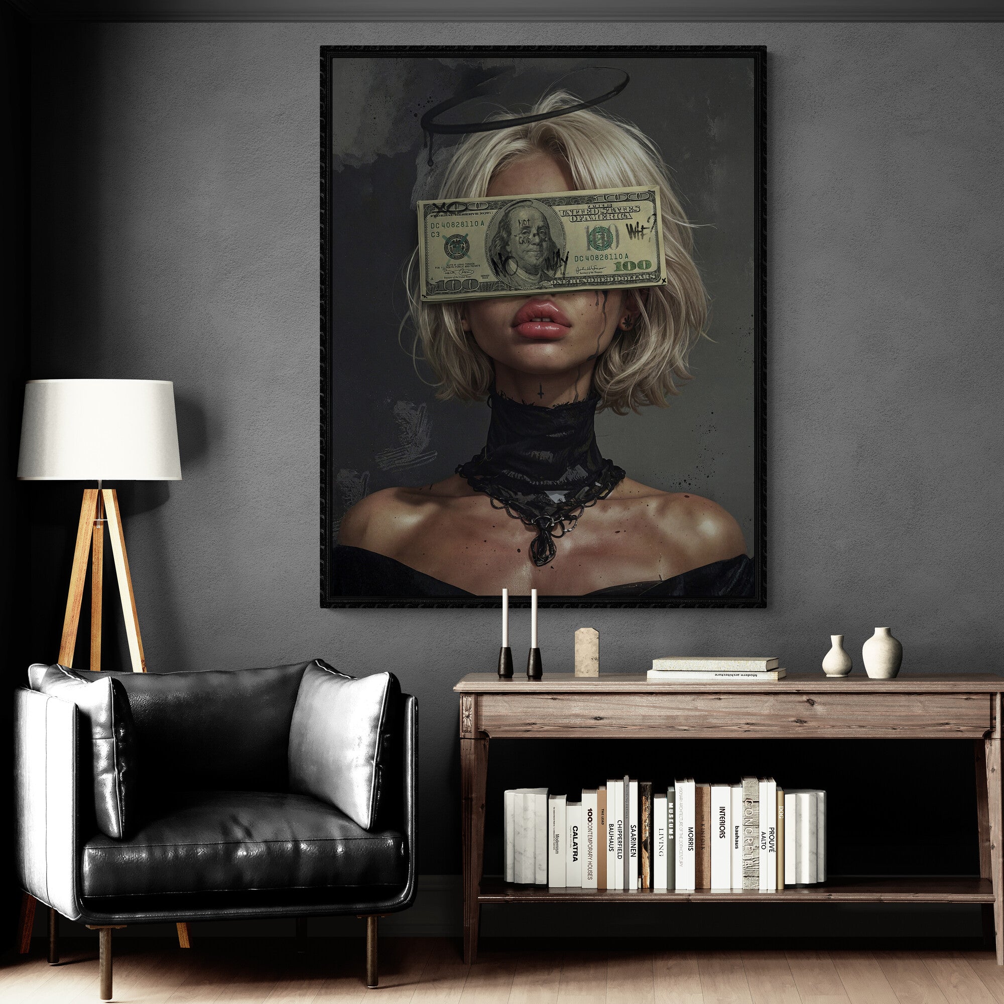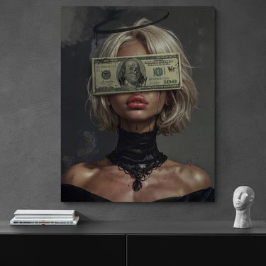 The “Money Blind” Pop Art Canvas is a bold representation of modern luxury and the obsession with wealth. Featuring a mysterious woman with a $100 bill covering her eyes, this artwork explores the connection between beauty, money, and desire — a striking piece that provokes thought and admiration alike.