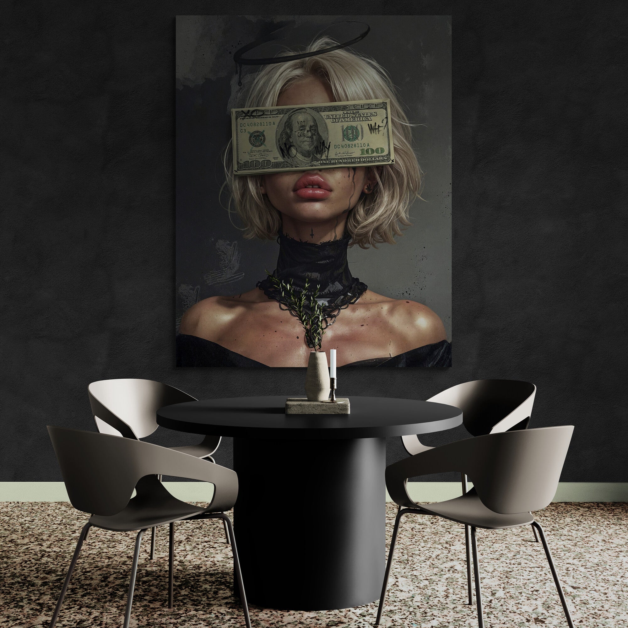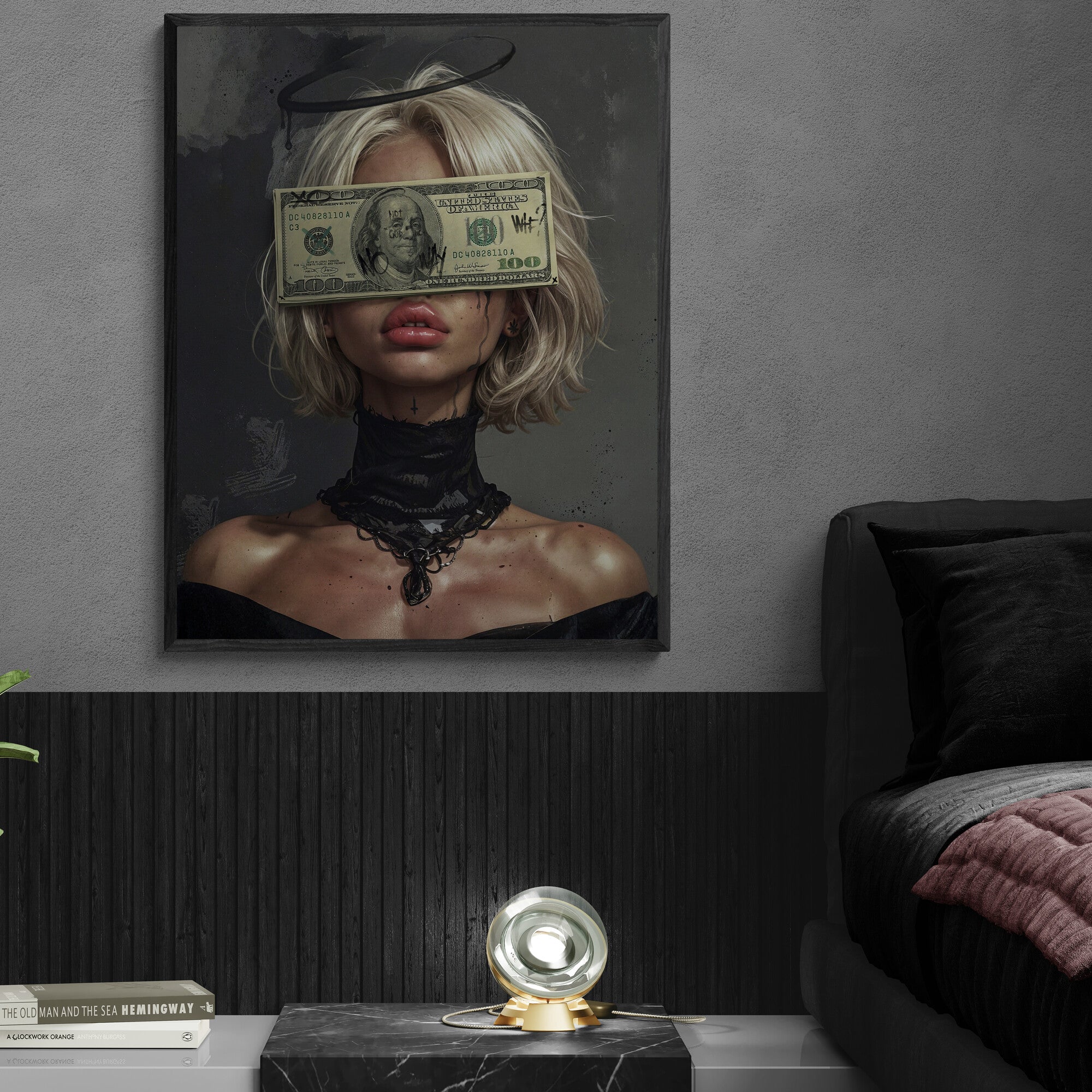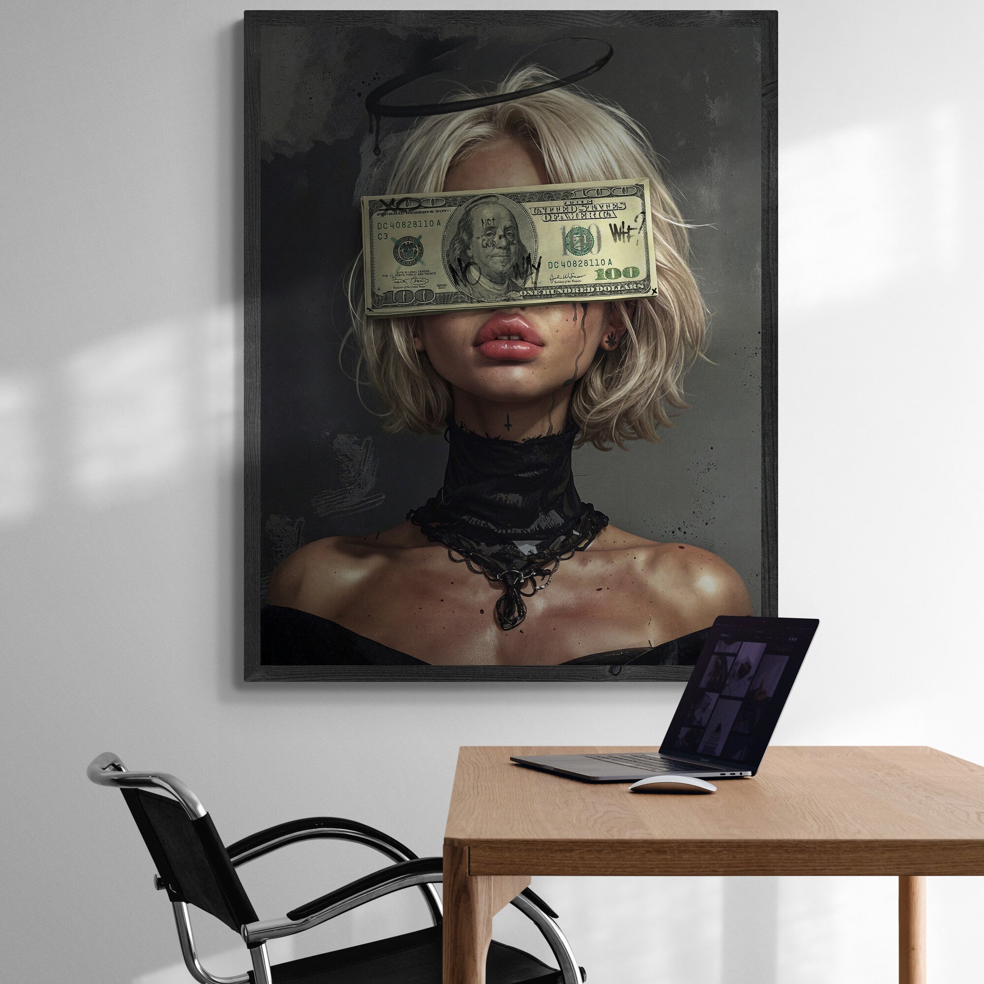 The “Money Blind” Pop Art Canvas is a bold representation of modern luxury and the obsession with wealth. Featuring a mysterious woman with a $100 bill covering her eyes, this artwork explores the connection between beauty, money, and desire — a striking piece that provokes thought and admiration alike.