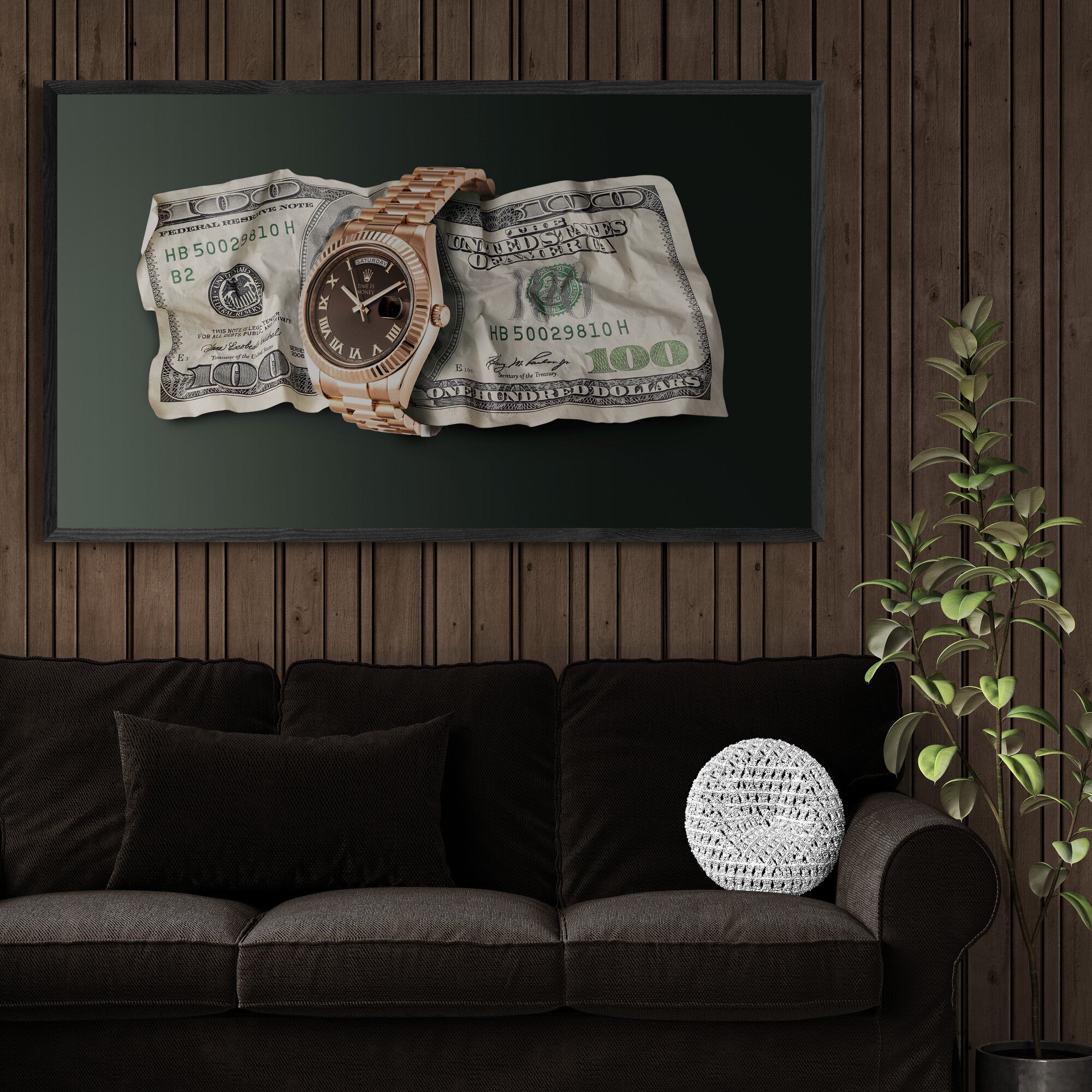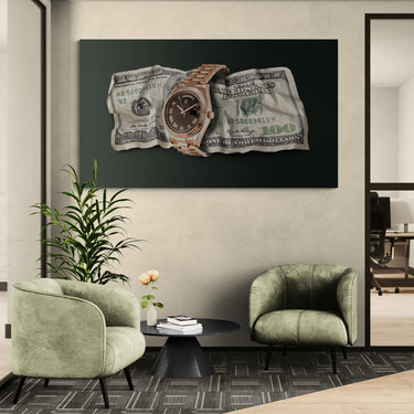 This bold “Time Is Money” Pop Art Canvas blends two ultimate symbols of success — luxury and money. A striking image of a gold watch wrapped around a $100 bill, this artwork captures ambition, precision, and the relentless pursuit of excellence.