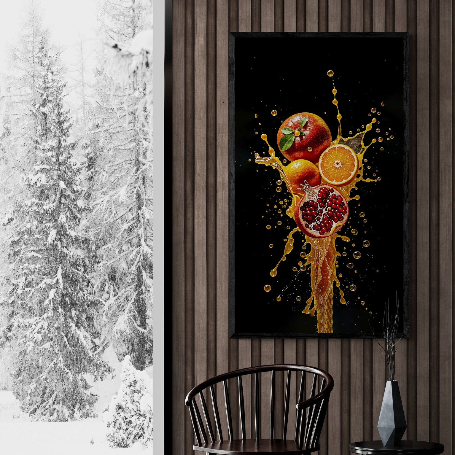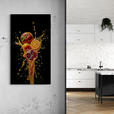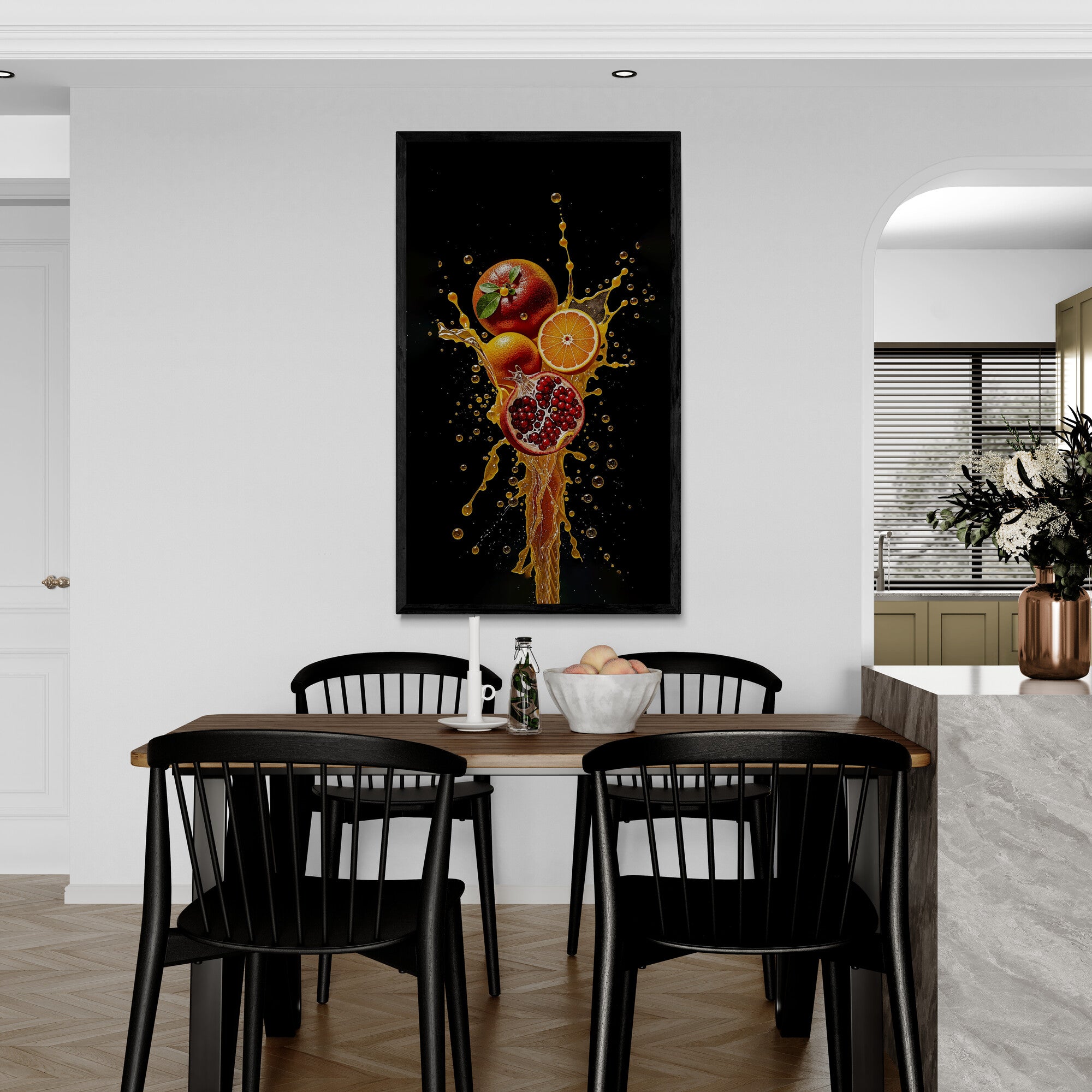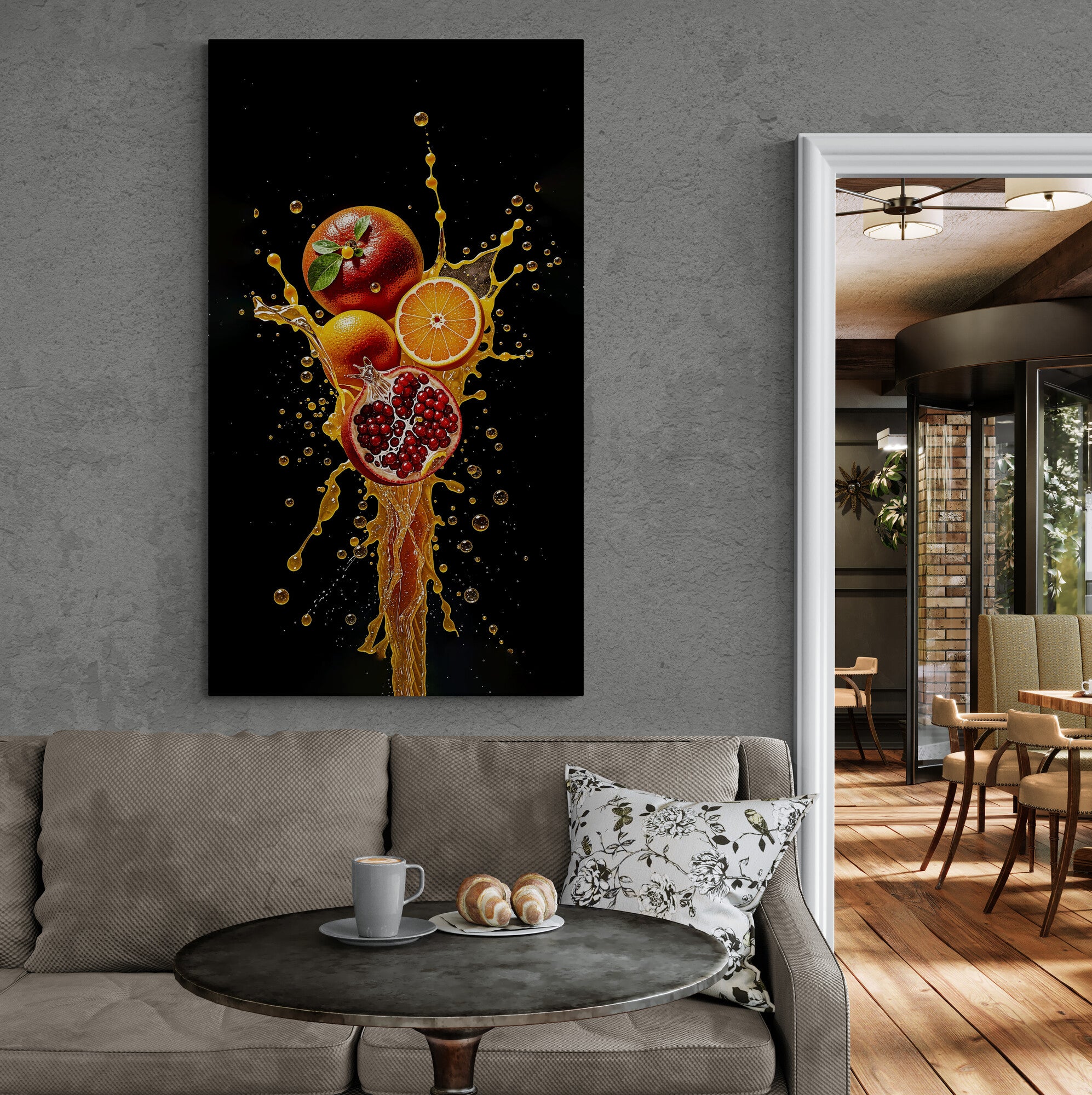 Our “Citrus Splash” fruit canvas wall art captures the energy and vibrancy of nature’s juiciest flavors. With dynamic splashes of orange, grapefruit, and pomegranate bursting on a sleek black background, this artwork adds a refreshing and modern touch to any kitchen or dining area.