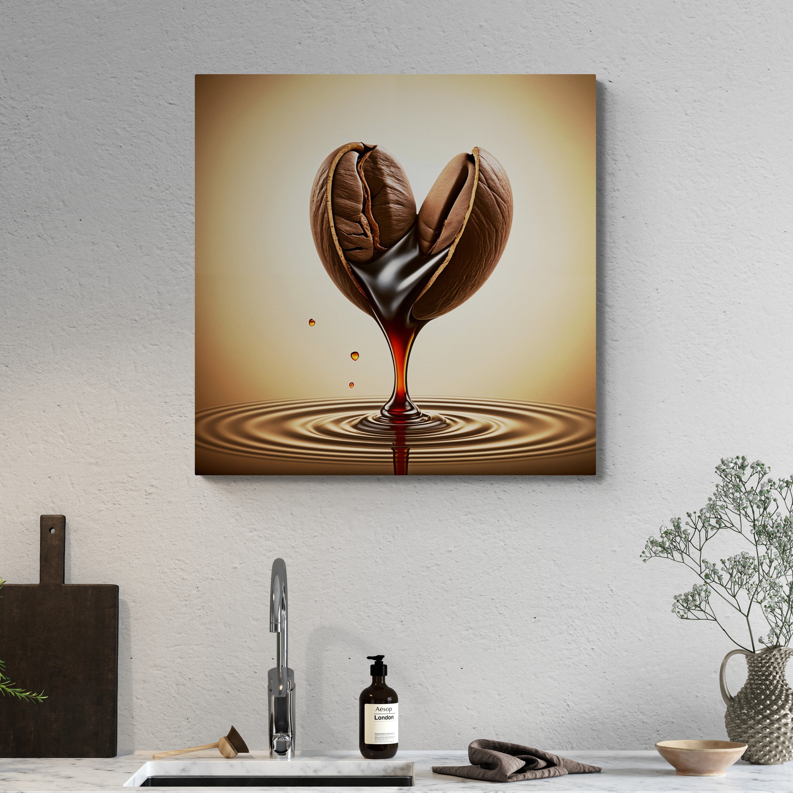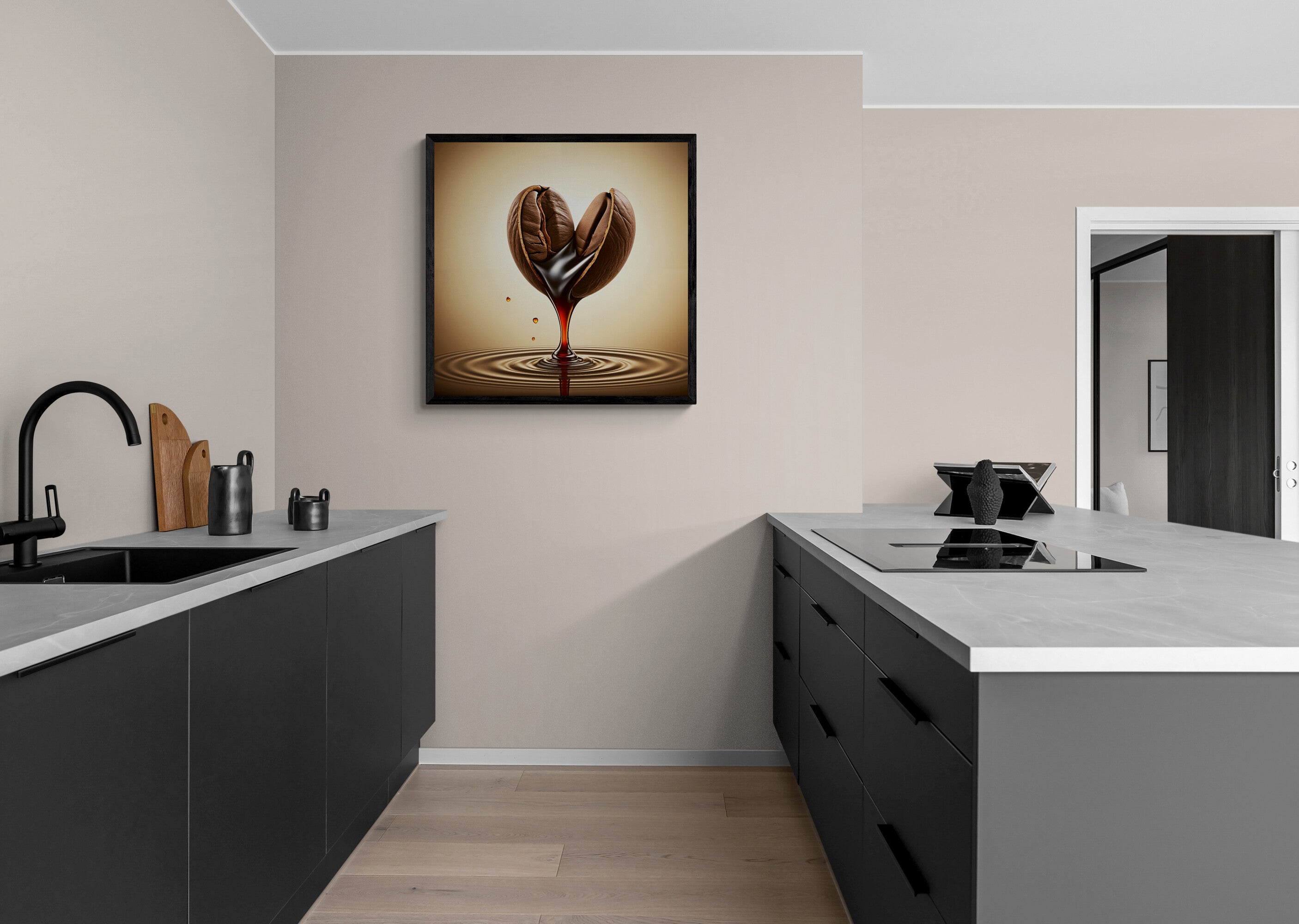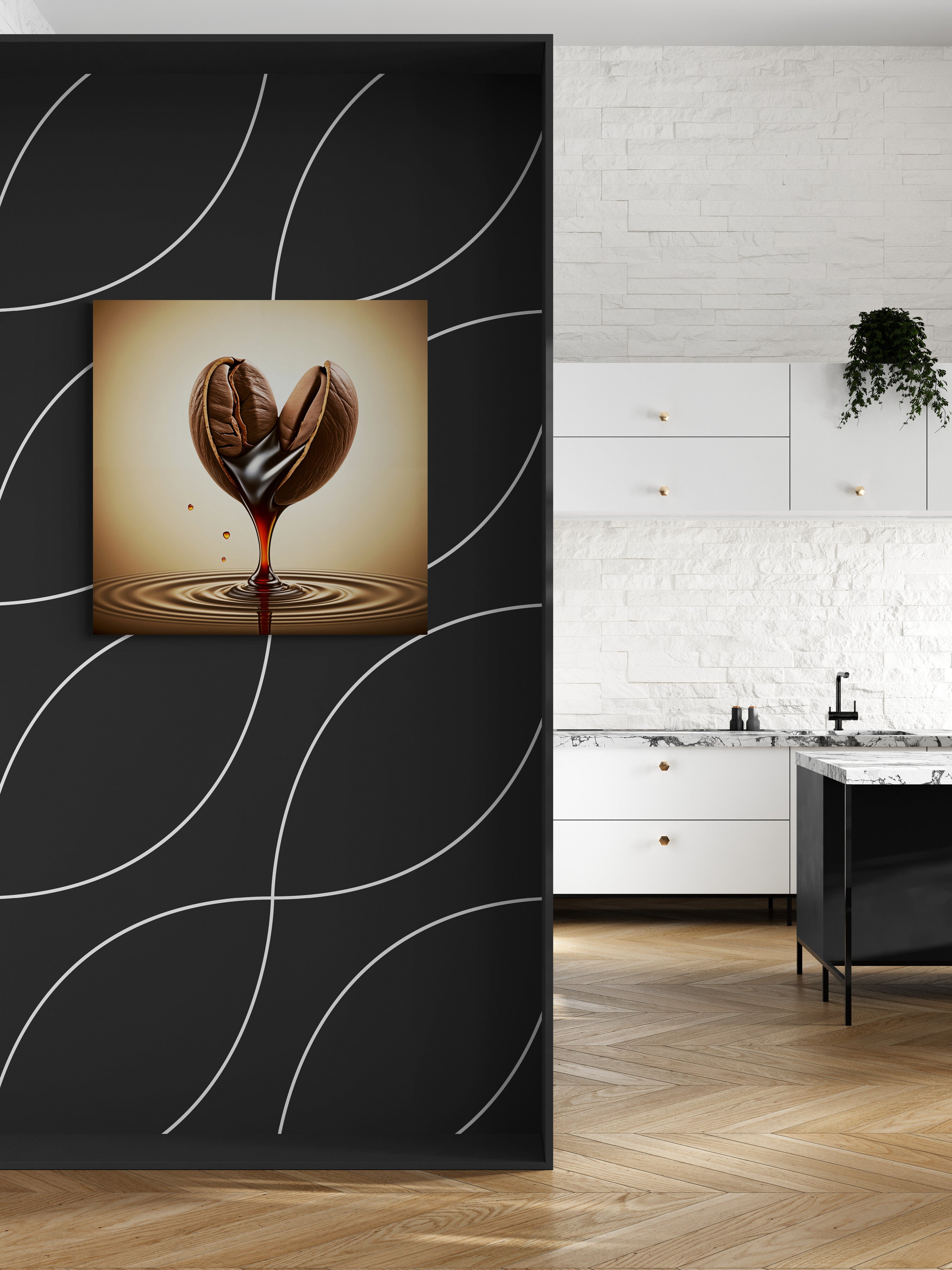 Our Coffee Bean Heart Canvas captures the beauty and aroma of your favorite morning ritual. Featuring a striking close-up of coffee beans forming a heart with rich espresso dripping into a smooth swirl, this artwork radiates warmth, comfort, and sophistication.