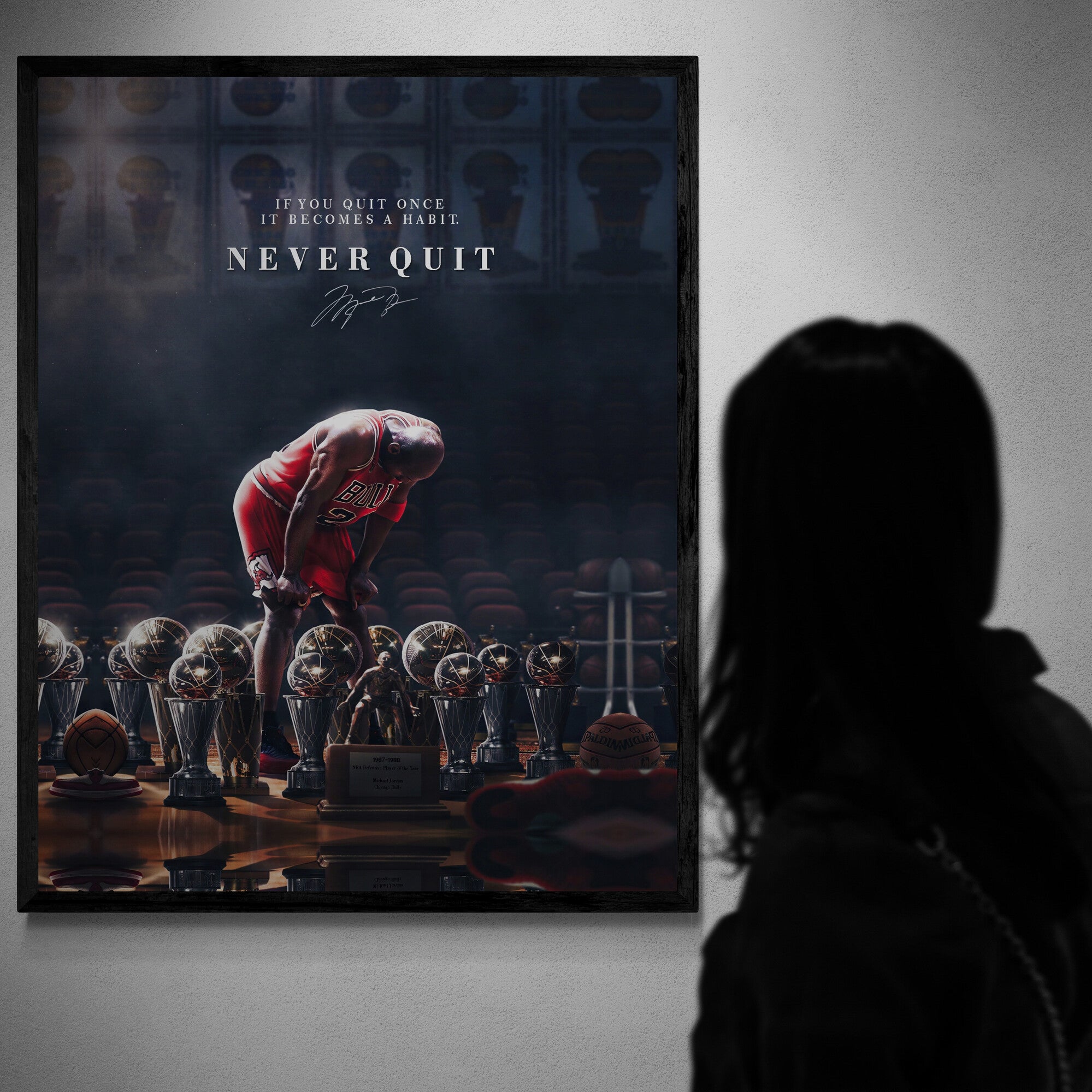 The design features an iconic moment of reflection surrounded by trophies — a visual reminder that greatness is earned, not given. Add this statement piece to your office, gym, or living room to stay inspired every day.
