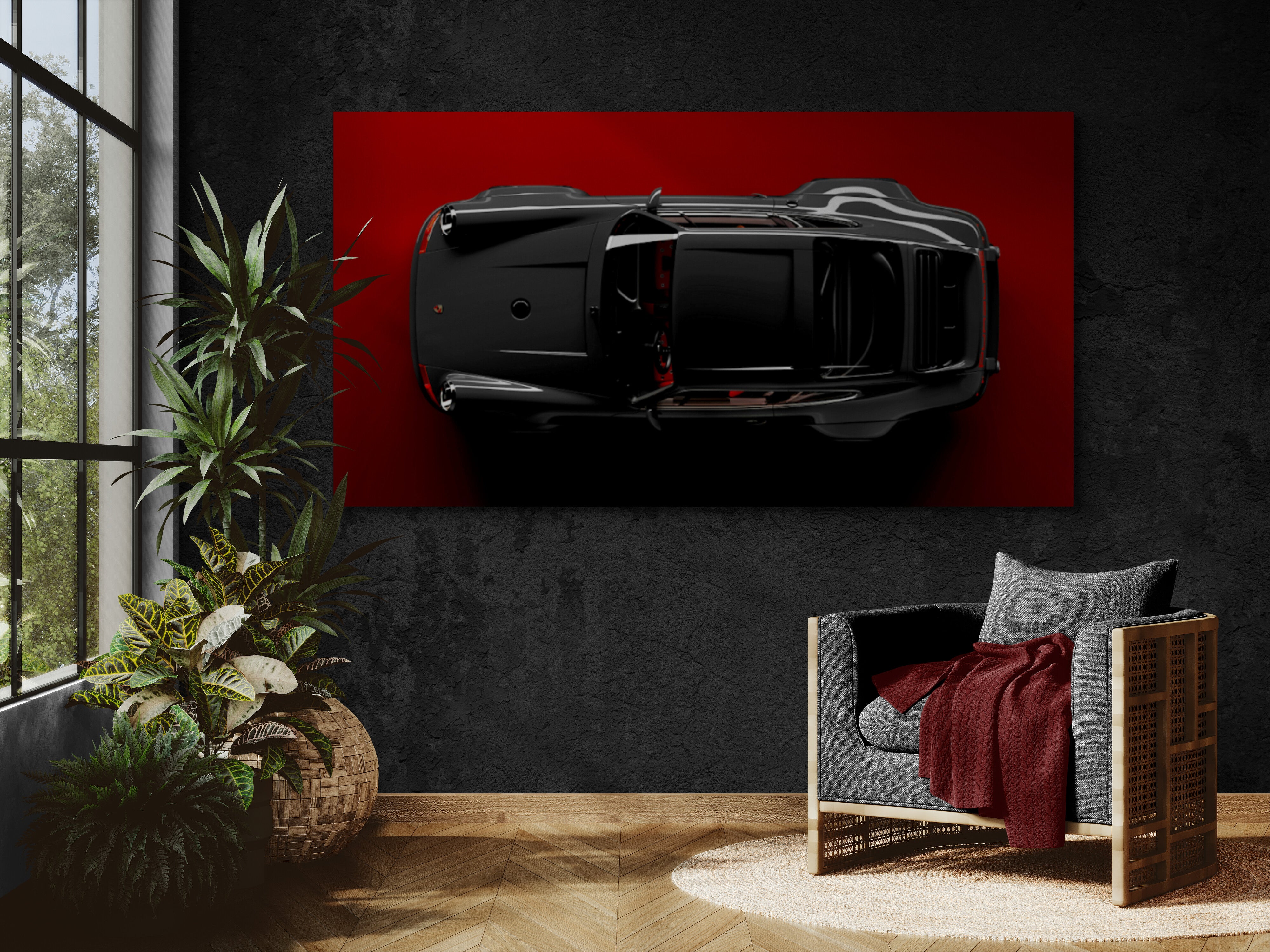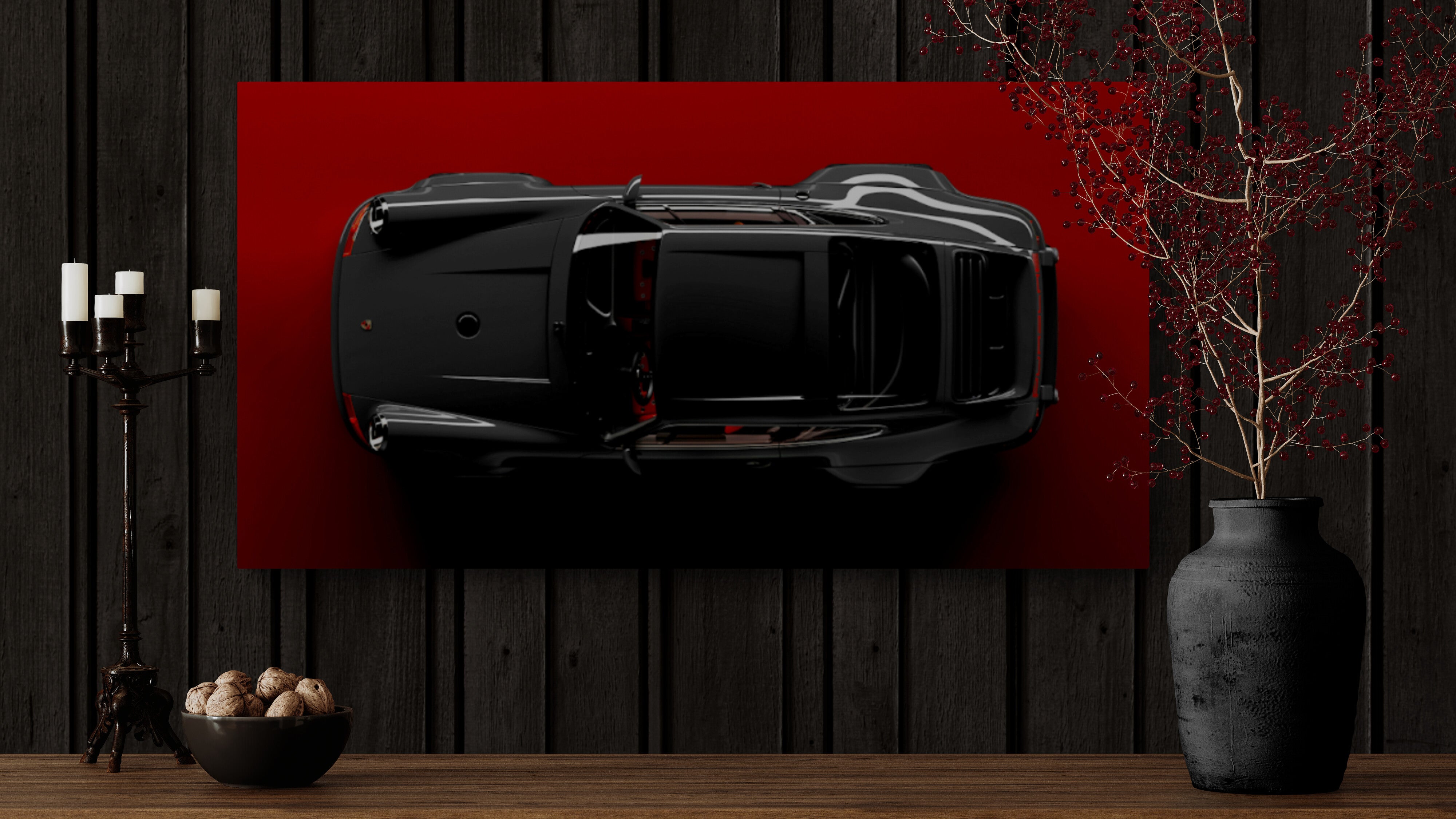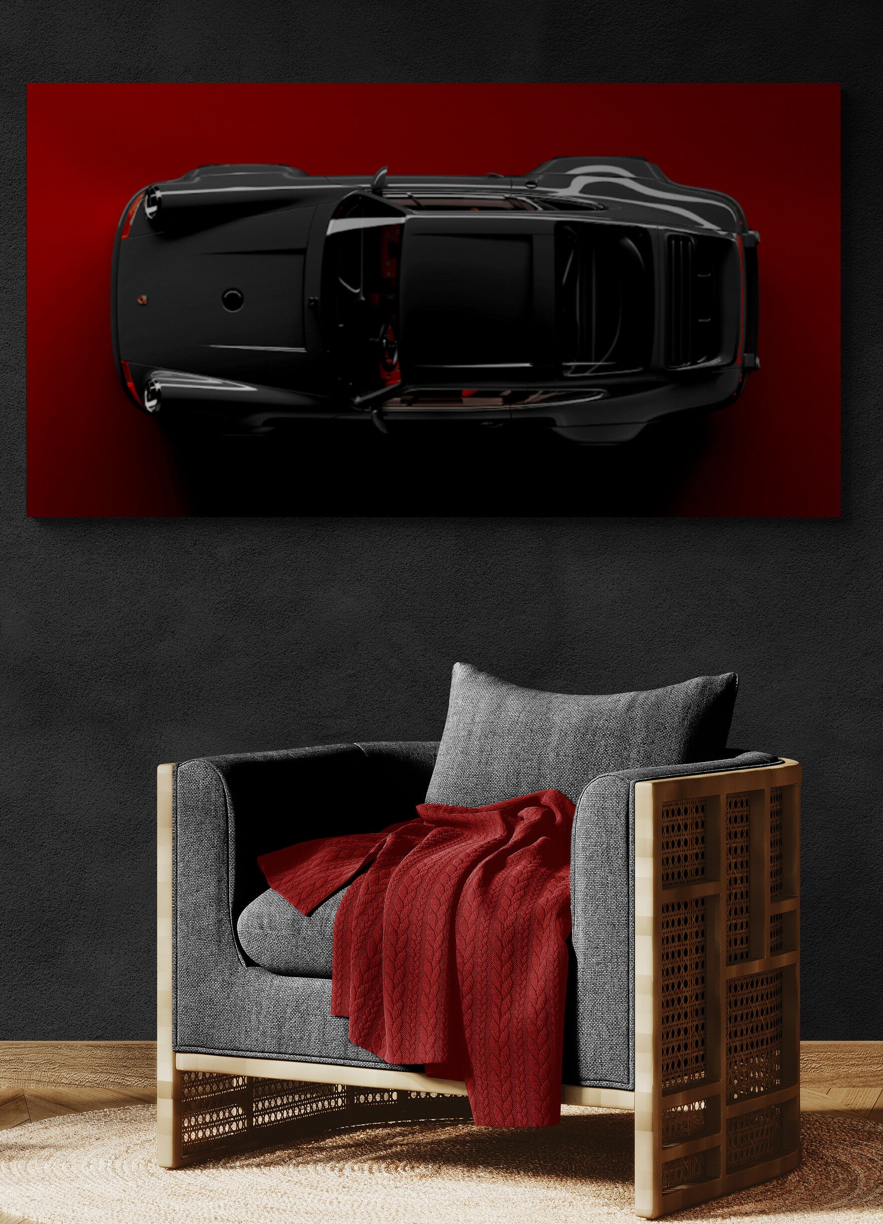 Celebrate automotive excellence with this Porsche 911 canvas wall art. Featuring a top-view of the iconic black 911 set against a striking red background, this artwork captures the timeless beauty and power of one of the world’s most legendary sports cars.