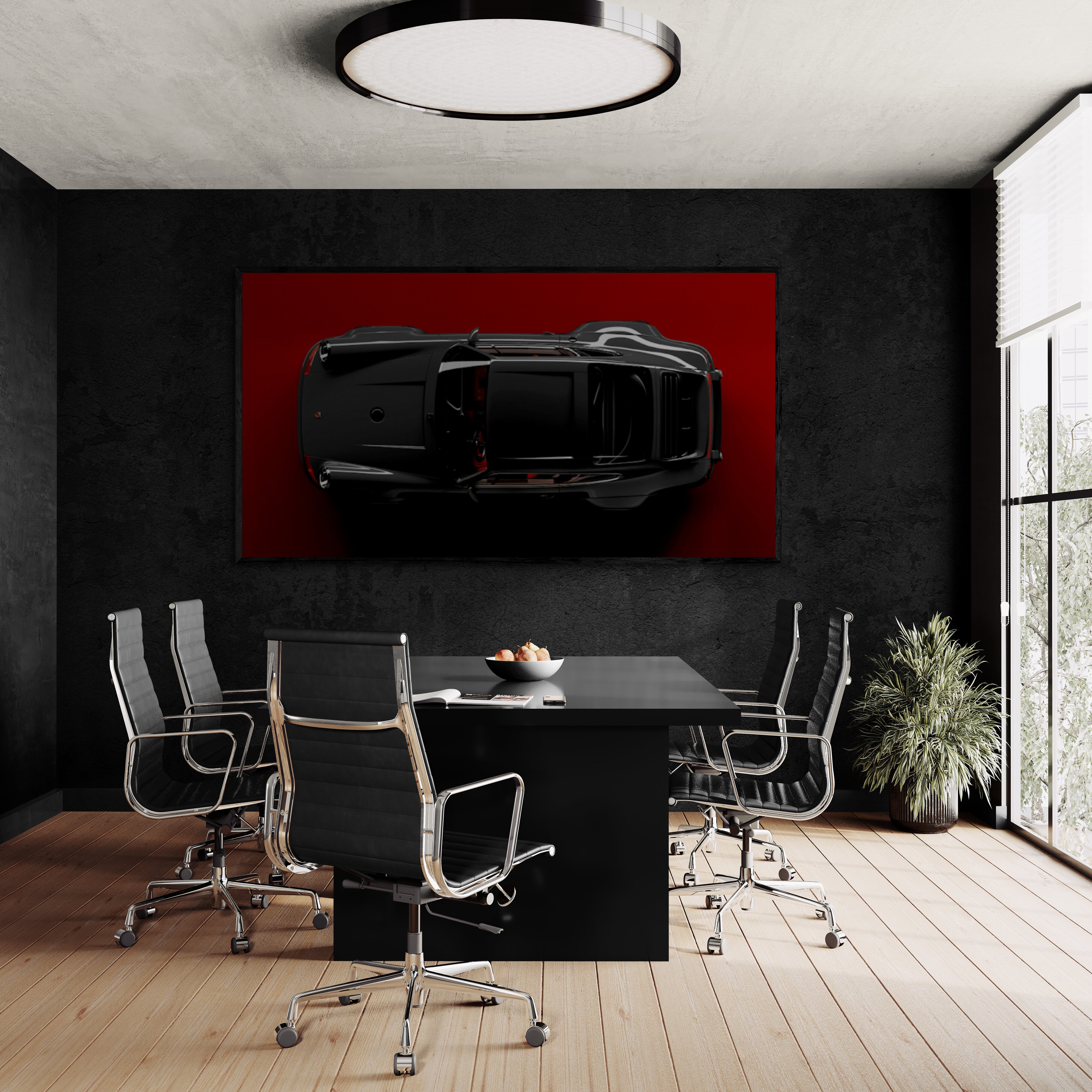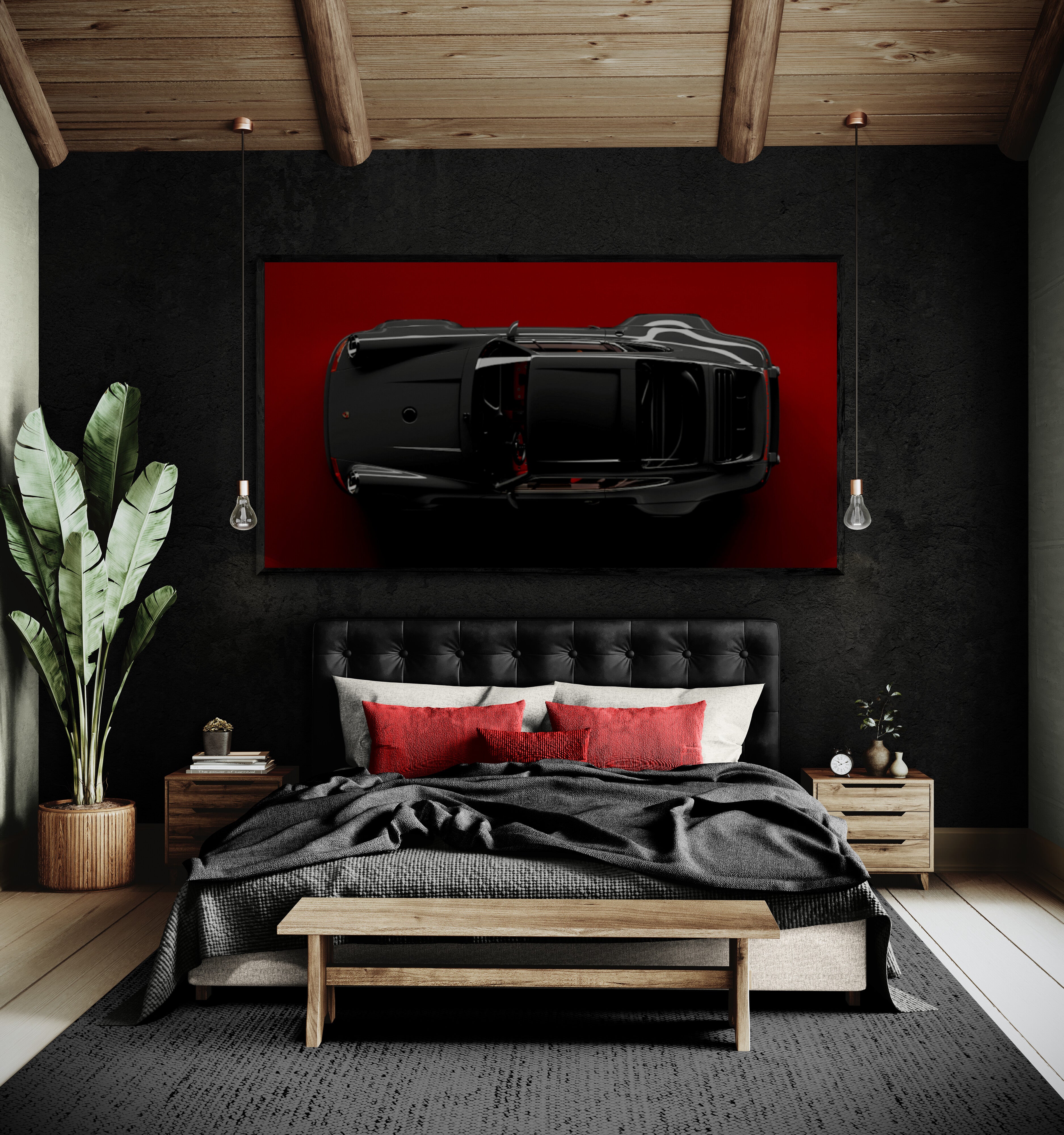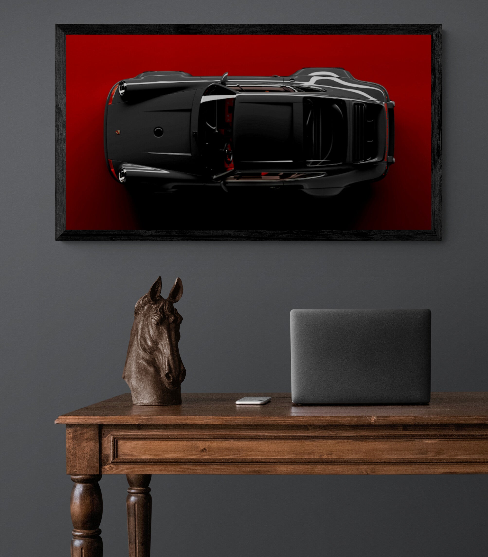 Celebrate automotive excellence with this Porsche 911 canvas wall art. Featuring a top-view of the iconic black 911 set against a striking red background, this artwork captures the timeless beauty and power of one of the world’s most legendary sports cars.